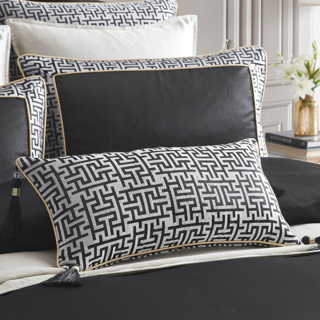 Elevate your bedroom with Tywin deluxe accessories in striking black, featuring an attached flange showcasing a sophisticated geometric key pattern border. It is framed with gleaming gold piping, it exudes opulence and modern elegance. The co ordinating accessories feature the geometric key pattern all over and tailored gold cord piping. Perfectly designed for style and comfort, this premium piece adds a touch of luxury to your space, making it a centrepiece of refinement.