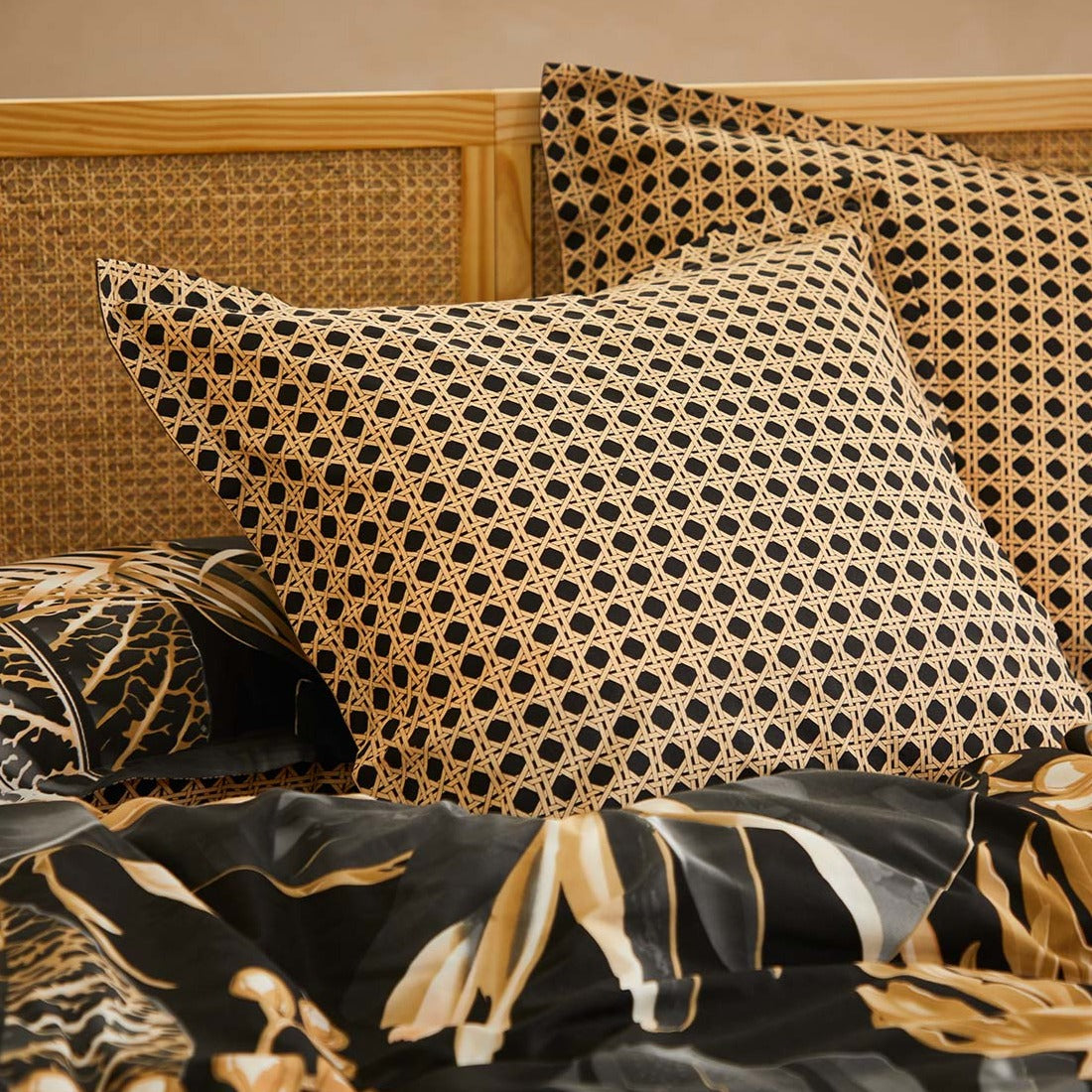 The Danton Quilt Cover Set Range Black by Logan and Mason Lifestyle is tropical luxe. Reminiscent of Hawaiian nights, branching palms lay across the bed in dramatic black and gold highlights. The contrasting reverse features a rattan cane inspired pattern to enhance the tropical vibe. Complete the look with coordinating European pillowcase.