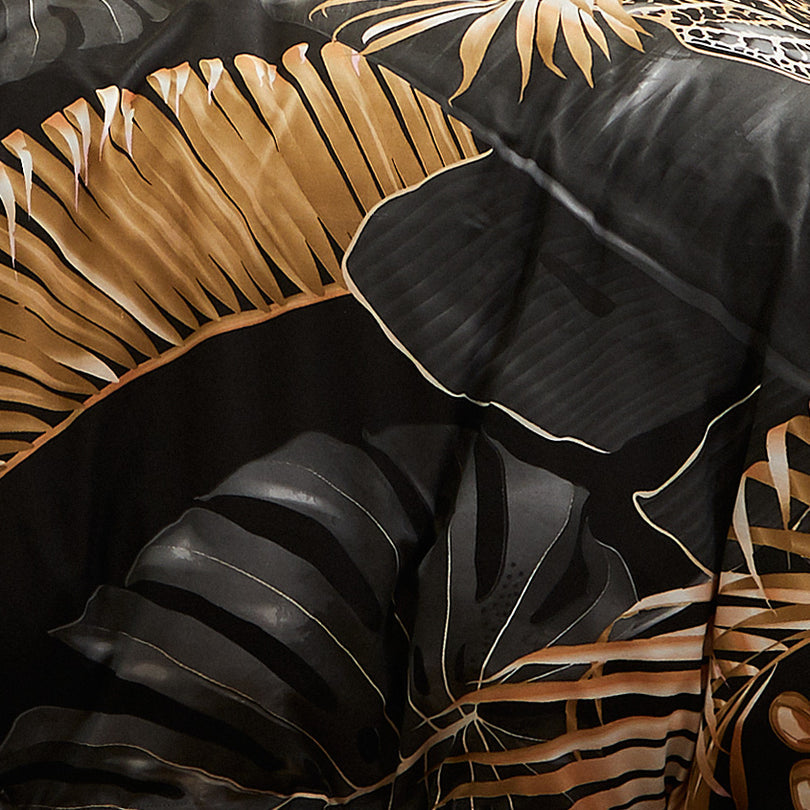 Branching palms lay across the bed in dramatic black and gold