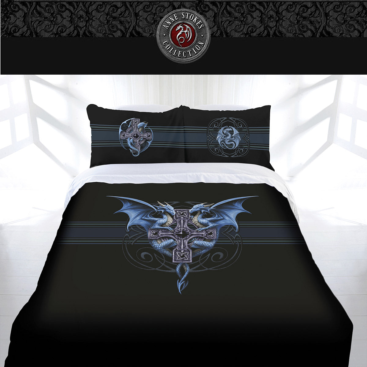One of the original designs of Anne Stokes that creates a captivating touch and adds a mystical appeal to any bedroom. It features a magical twin dragons print design entwined on a Celtic cross printed in mysterious colour tones of black, blue, grey, silver, gold, brown, and white that will create a beautiful illustration effect. Made from premium quality Polyester Cotton blend fabric.