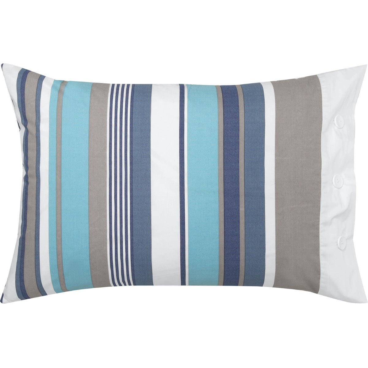 Trent Lagoon Quilt Cover Set By Logan & Mason takes summer from the beach to the bedroom. Classic nautical stripes in shades of aquamarine, navy and taupe are interspersed with white, keeping the palette fresh and coastal. The white cuff with button opening complements the nautical styling.