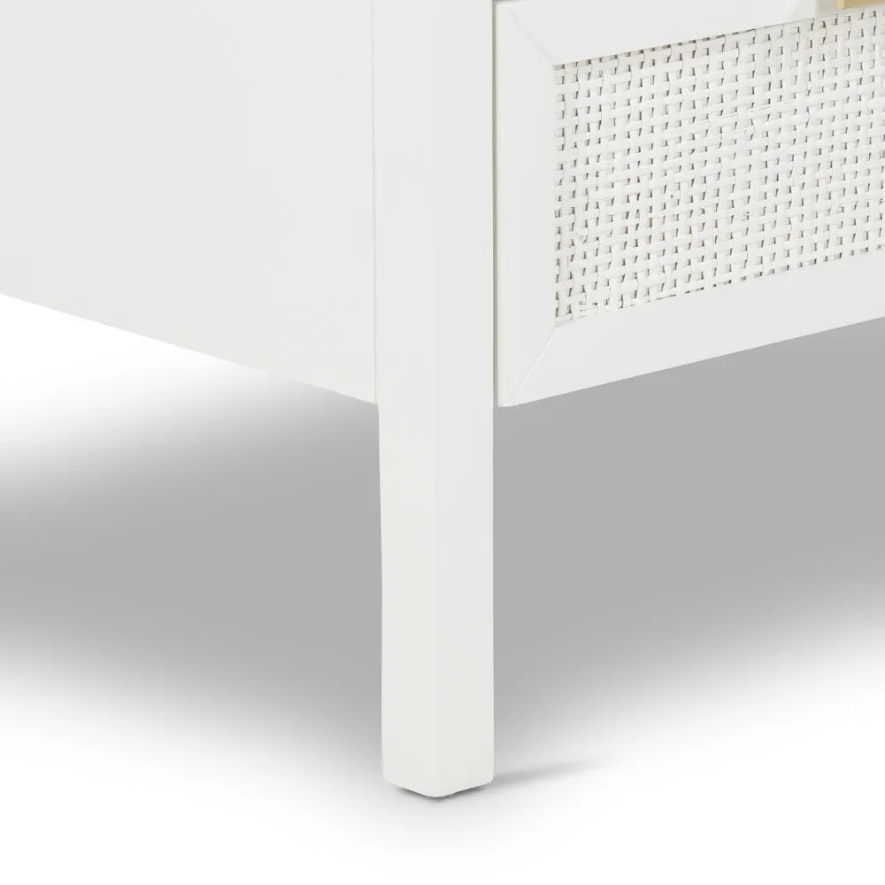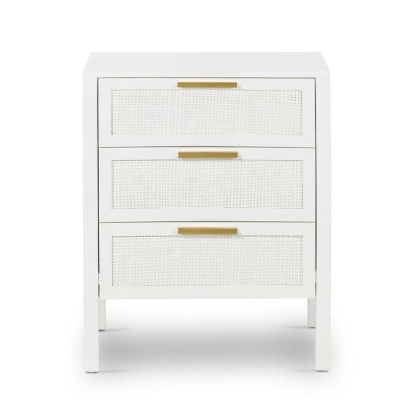 Make your nighttime essentials accessible and stylish with our Santorini Bedside Drawer in White. Crafted with a solid wood frame, this bedside table features three pull-out drawers, each accented with a chic gold drawer pull and charming rattan woven insert on the front. Perfect for keeping your nighttime essentials close at hand, this piece adds a touch of sophistication to any bedroom. For a cohesive and elevated aesthetic, pair it with other pieces from our Santorini collection.