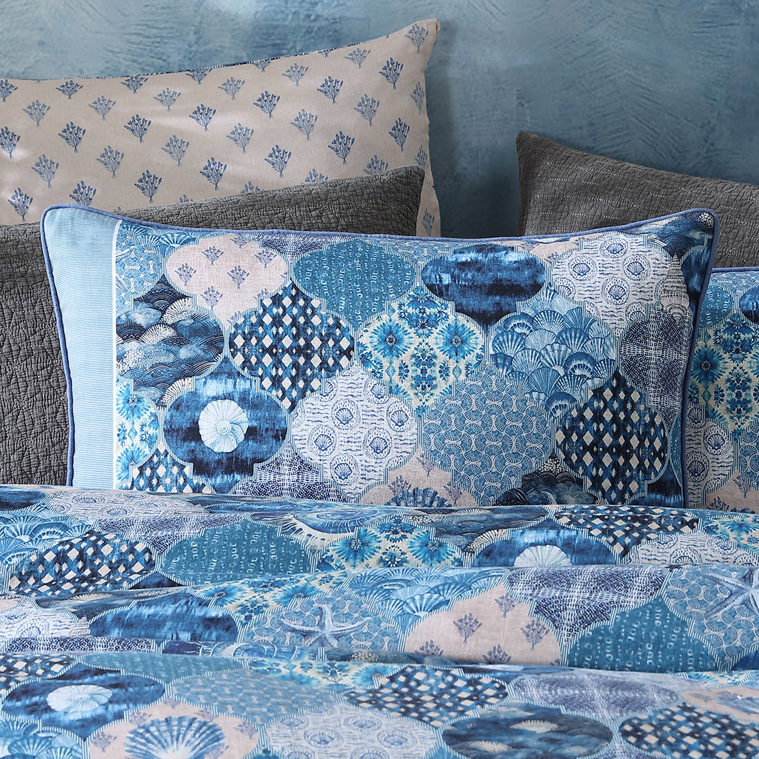 Escape to the coast with the Balmain Quilt Cover Set, where ocean-inspired beauty meets timeless design. A soothing palette of blues and whites sets the scene, featuring delicate seashells and intricate Turkish tile motifs filled with coastal elements. A refined pinstripe border frames the design, adding a crisp, tailored touch. For a charming contrast, the reverse side showcases a navy posy print on a linen-textured background, offering a subtle yet stylish alternative. Fresh, breezy, and effortlessly elegant, the Balmain Quilt Cover Set brings relaxed seaside charm to your bedroom.