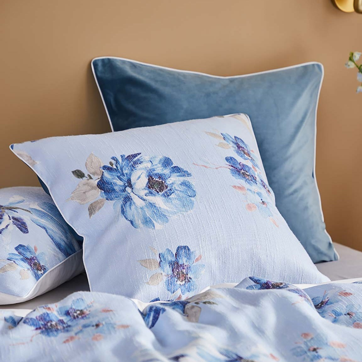 Lara Blue capture the beauty of nature with delicate floral clusters in tonal shades of blue, Printed on a slub fabric to provide depth and texture, Lara is elegantly finished with cord piping in white. Layer in luxury with reversible European pillowcases, backed with softly textured velvet for multiple styling options.