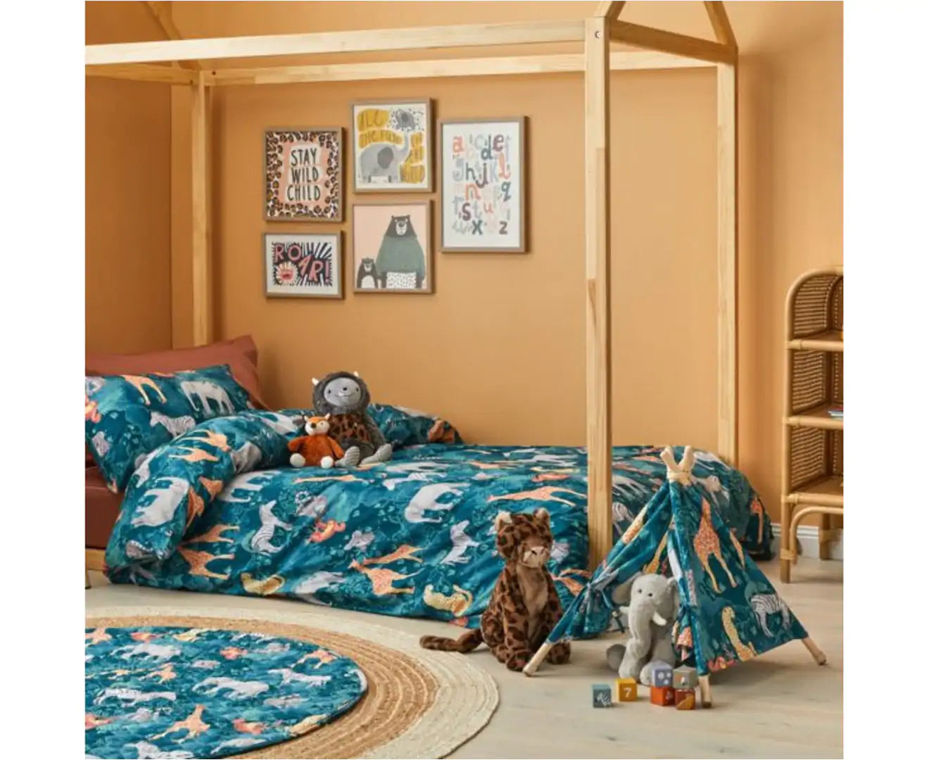Measuring 56cm high and featuring four sturdy wooden poles, this Teepee is a great size to easily move around the house and also ideal for travel. Team this Teepee with the Jungle Explorer Kids Bed Linen and Quilted Playmat. Designed in-house.