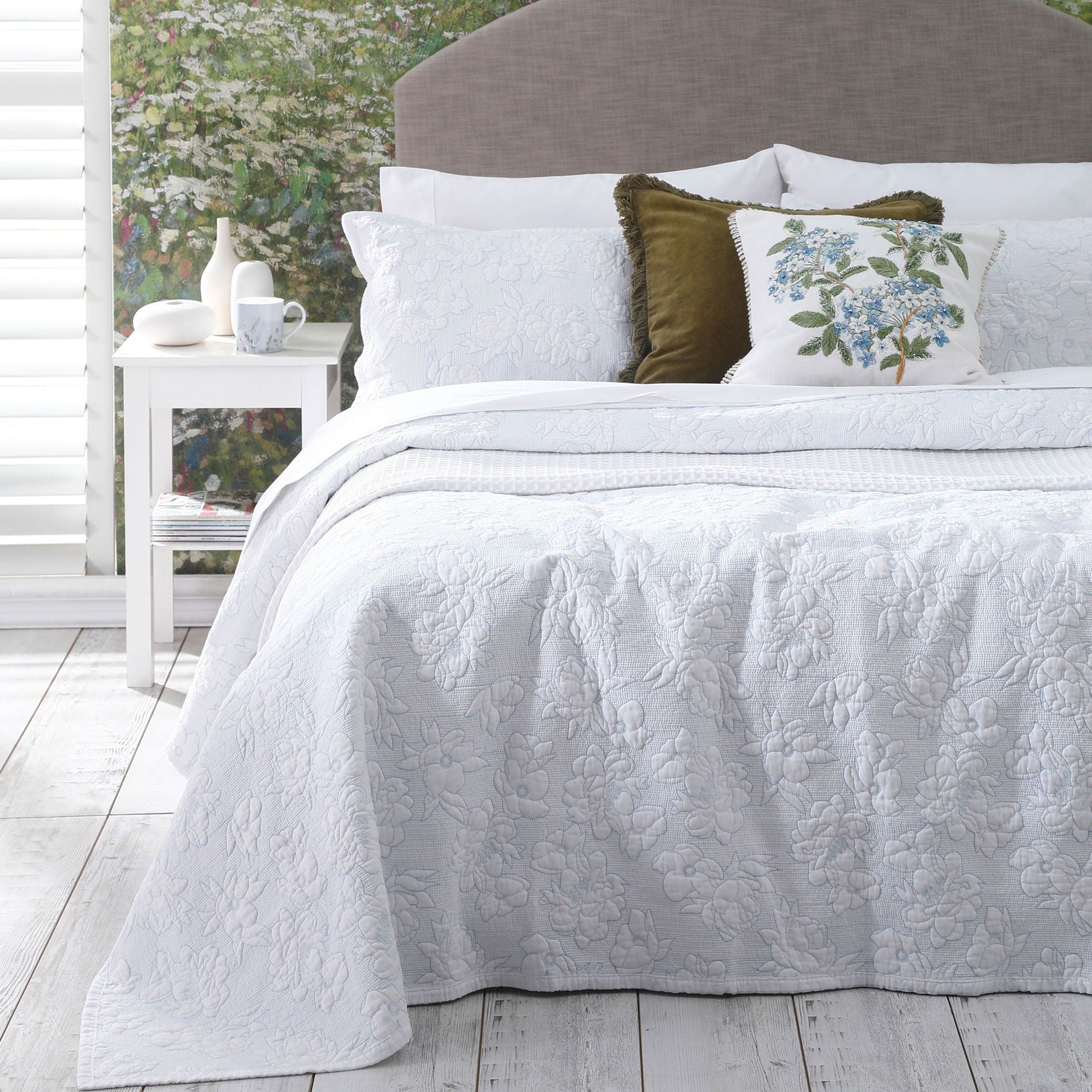 Nalini Bedspread is a new quilted M.M Linen botanical design with soft blue quilting stitches contrasting with the freshness of white pure cotton. architectural styles. ivory reverse side.