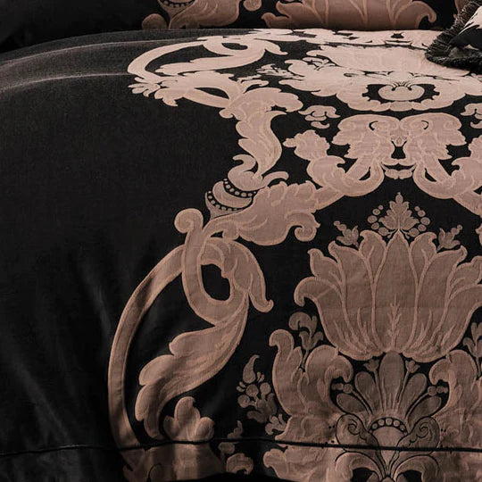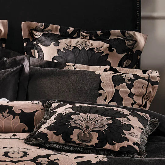 The Dionisia Quilt Cover Set Range Black from Grace By Linen House enjoys a classic damask design that dazzles with its sophisticated combination of black and gold. A luxury jacquard that exudes a master bedroom feel. With an aesthetic that is both timeless and modish, the beguiling jacquard is finished with a tailored edge complete with satin-stitched borders and looks superb styled with its coordinating European pillowcases and fringed cushion.