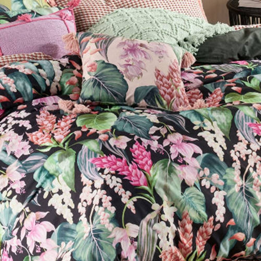 Your lush botanical paradise awaits in this hand-painted beauty printed on textured cotton slub. Created in the Linen House studio, Jonie is brimming with tropical flora and foliage in a vibrant yet harmonious palette. The set reverses to a plain-dyed deep green hue and looks best with a pair of coordinating fringed European pillowcases and tasseled cushion.