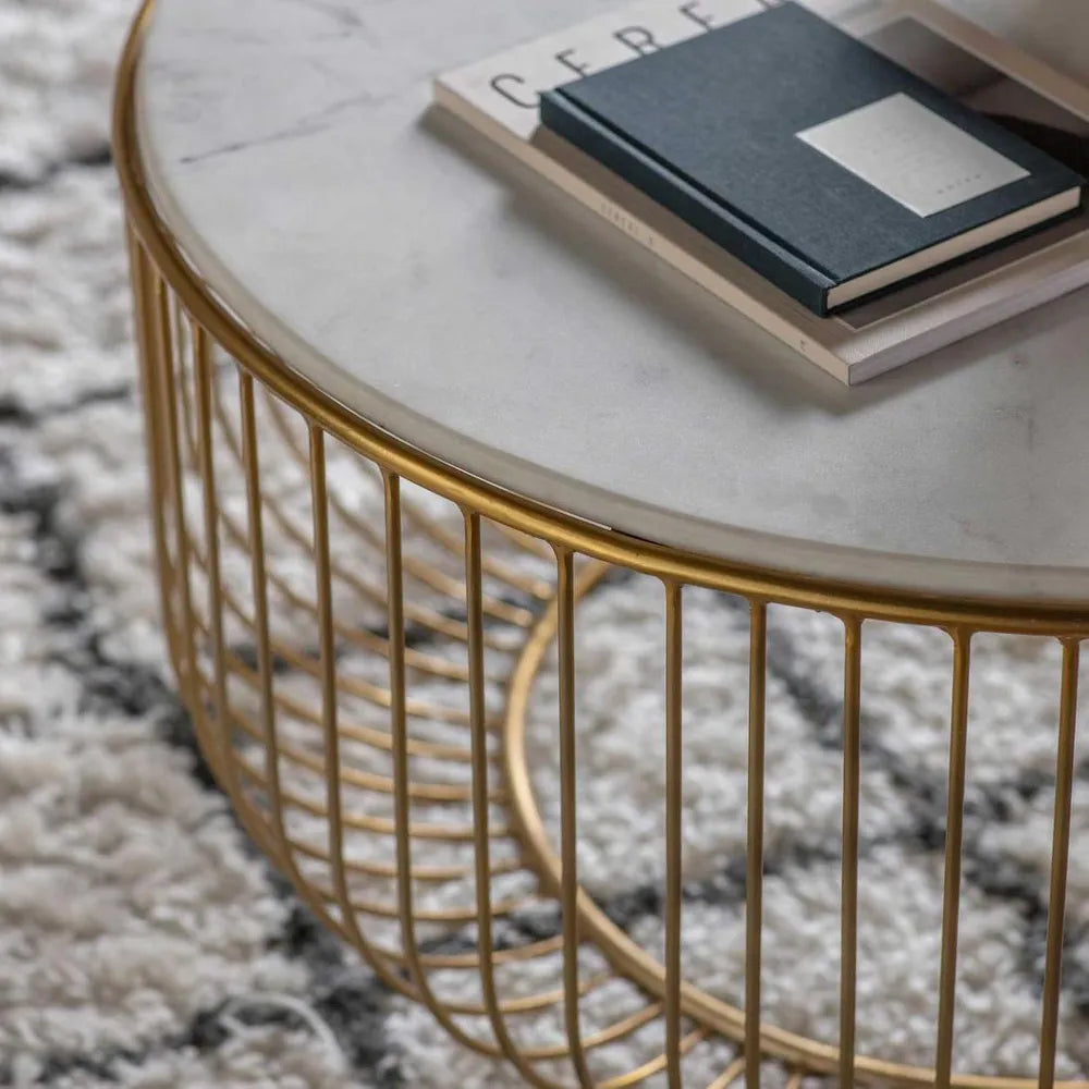 Transform any corner into a stylish vignette with the stylish Riley Marble Coffee Table. With its sleek cage like iron frame finished in brass and white marble top, this table offers both style and functionality in one compact package. A convenient spot for your coffee cup, books or homewares, this coffee table is sure to enhance any room. As this is a natural material, each piece will have its own unique characteristics, making every item one of a kind.