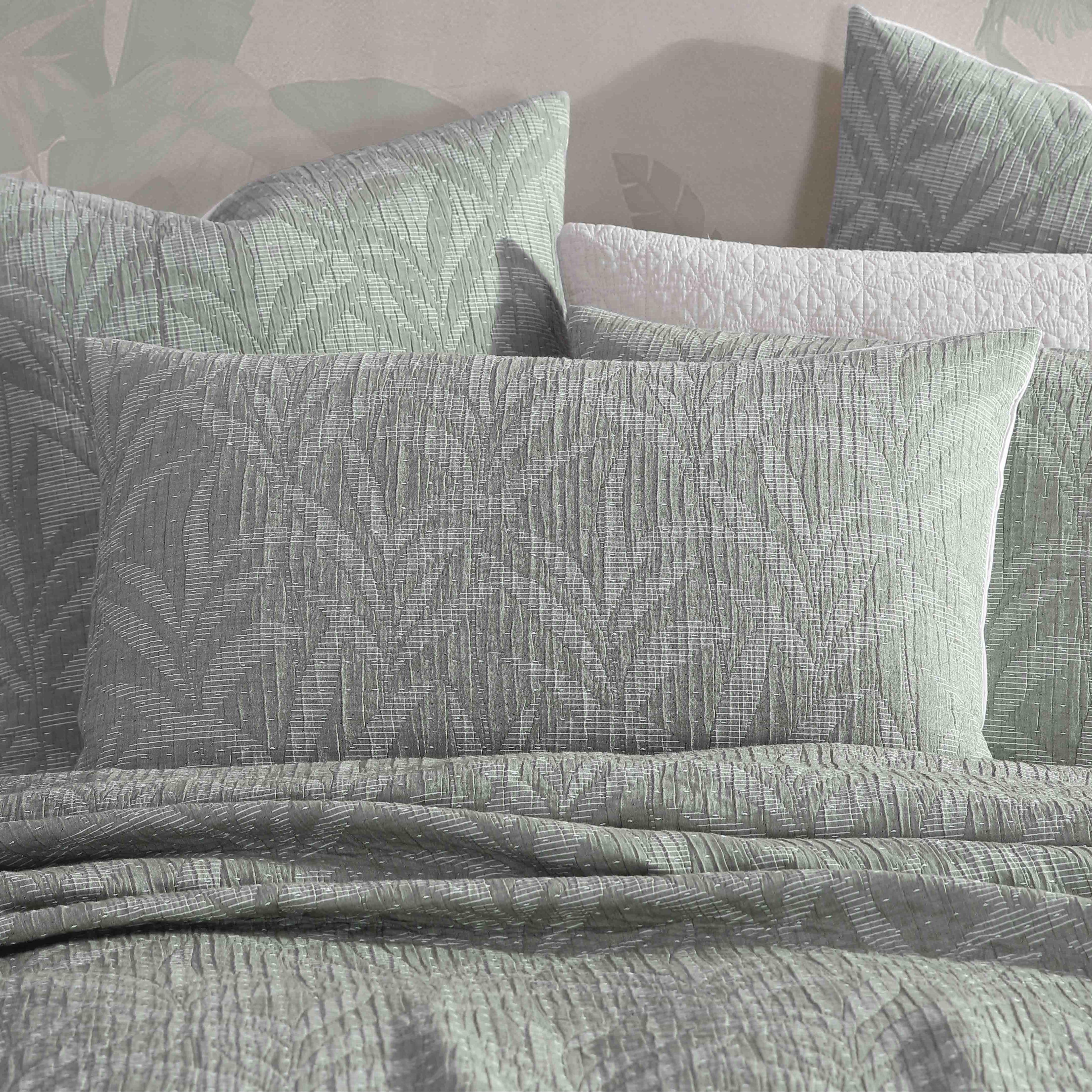 The Kailani coverlet set transforms your space into a tropical oasis. Featuring silhouetted leaves against a striking cilantro green background, this set captures the essence of an island retreat. The woven construction includes textural elements that mimic the appearance of hand quilting, adding depth and sophistication. Reversible fabric allows you to explore different looks and experiment with bold design choices in your interior. Finished with a self-bound edge, the Kailani coverlet set provides a refined and luxurious escape for your home.