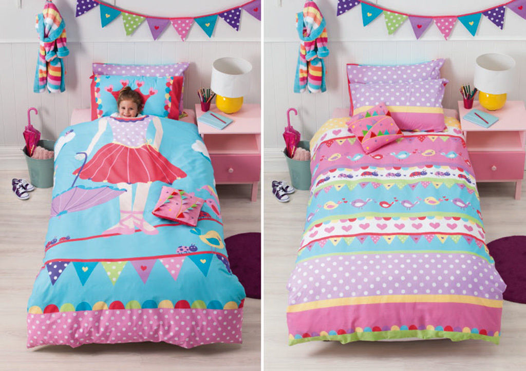 Let your little girl feel the experience of a circus performer with this Reversible Tabitha Tightrope Quilt Cover Set. It features large-scale print design of little princes doing tightrope walking that creates "Head in the hole" effect printed in blue, pink, red, yellow, purple, and white colours. It is made from easy care Polyester Cotton fabric in 180 thread count