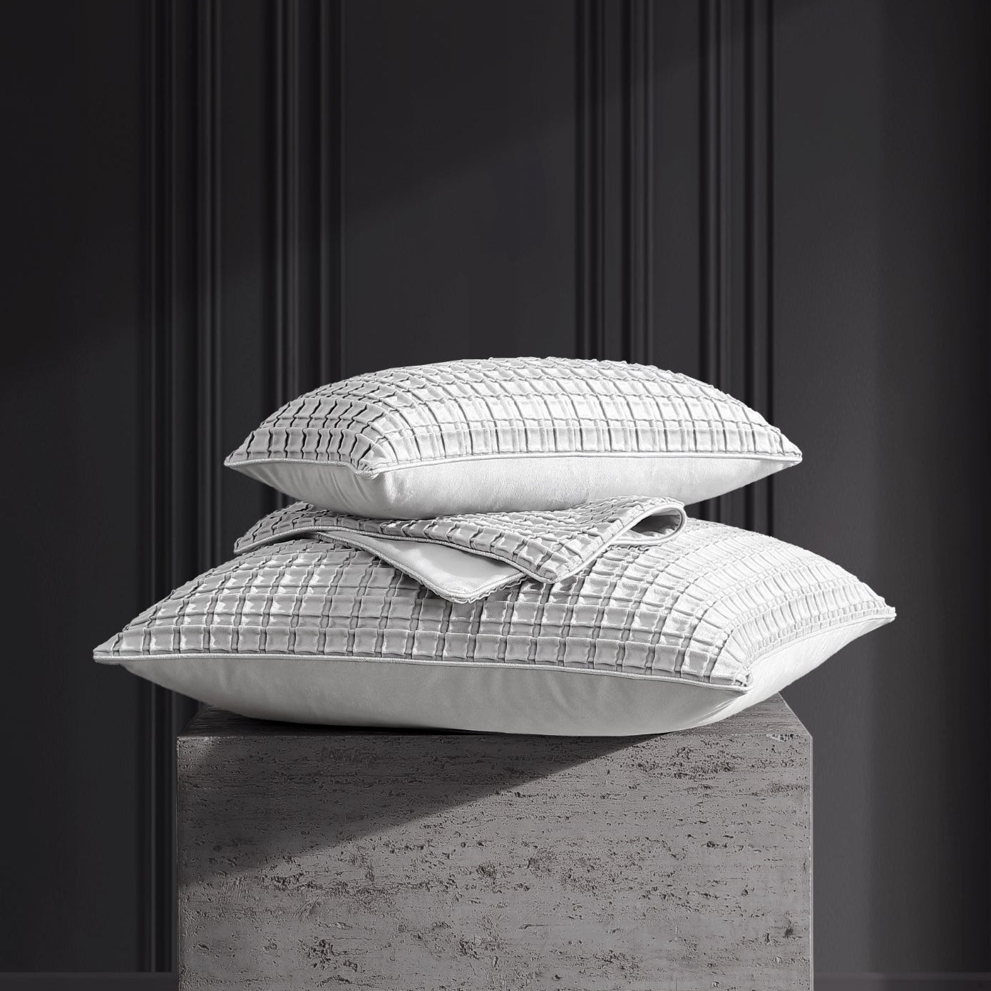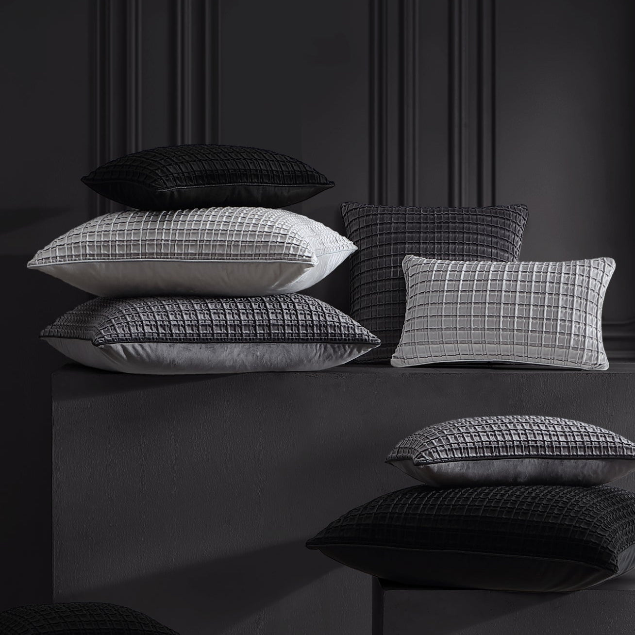 Opulence introduces a stunning new accessory range for Davinci, showcasing luxurious velvet with a pleated geometric design that effortlessly enhances any space. Available in versatile core colours, it pairs seamlessly with any existing Davinci collection. The addition of a metallic lurex corded piped edge adds a refined touch of elegance, making styling both effortless and sophisticated.