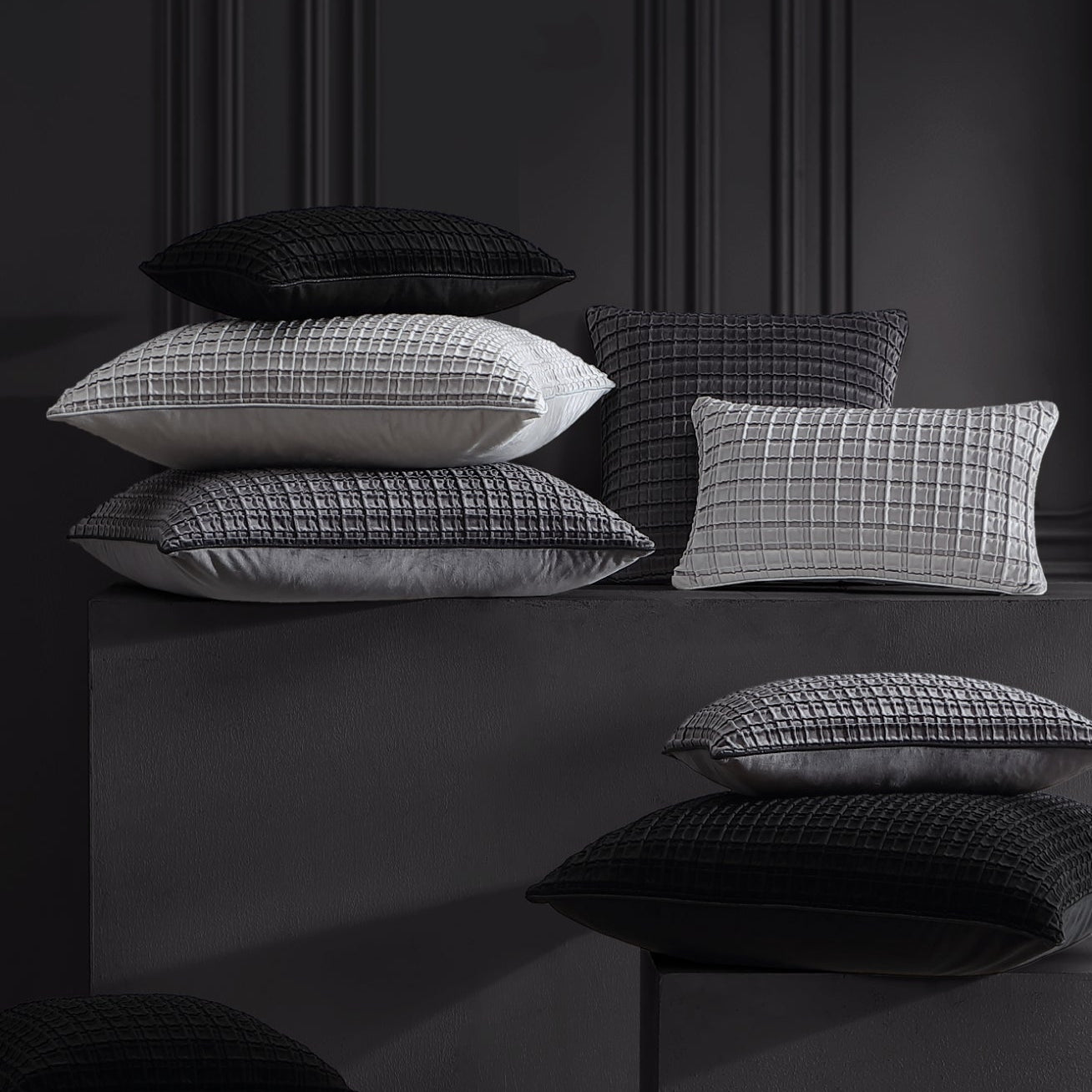 Opulence introduces a stunning new accessory range for Davinci, showcasing luxurious velvet with a pleated geometric design that effortlessly enhances any space. Available in versatile core colours, it pairs seamlessly with any existing Davinci collection. The addition of a metallic lurex corded piped edge adds a refined touch of elegance, making styling both effortless and sophisticated.