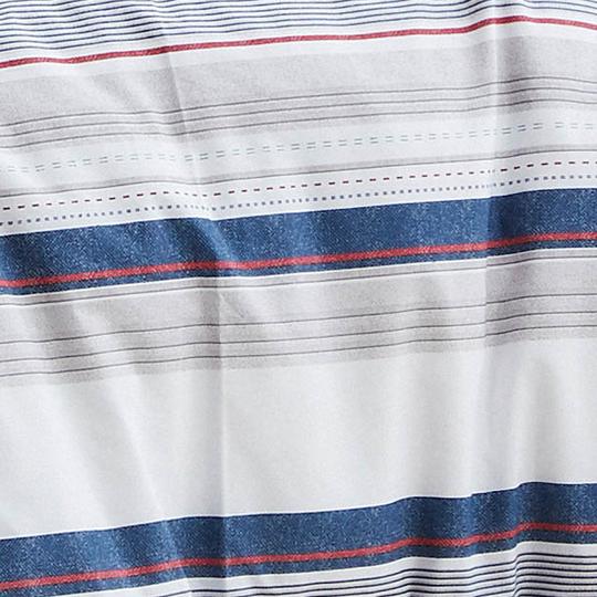 Boss Red takes the classic stripe to a new level. Variegated stripes in navy parallel with bands of red and linen on a patterned ground for a textured-look contrast. The smart look is framed with navy piping.