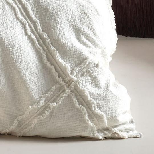 Heather's raw-finished diamond pattern enjoys soft, chenille-embroidered details on a garment-washed cotton jacquard – perfectly vintage.