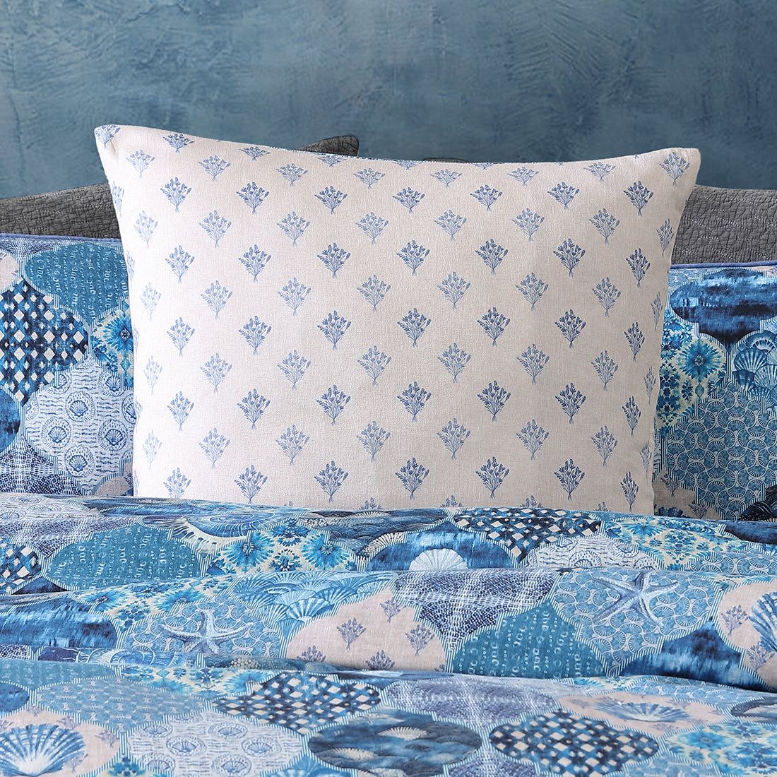Escape to the coast with Balmain Blue European Pillowcase, where ocean-inspired beauty meets timeless design. A soothing palette of blues and whites sets the scene, featuring delicate seashells and intricate Turkish tile motifs filled with coastal elements. A refined pinstripe border frames the design, adding a crisp, tailored touch. For a charming contrast, the reverse side showcases a navy posy print on a linen-textured background, offering a subtle yet stylish alternative. Fresh, breezy, and effortlessly elegant, the Balmain Blue European Pillowcase brings relaxed seaside charm to your bedroom.