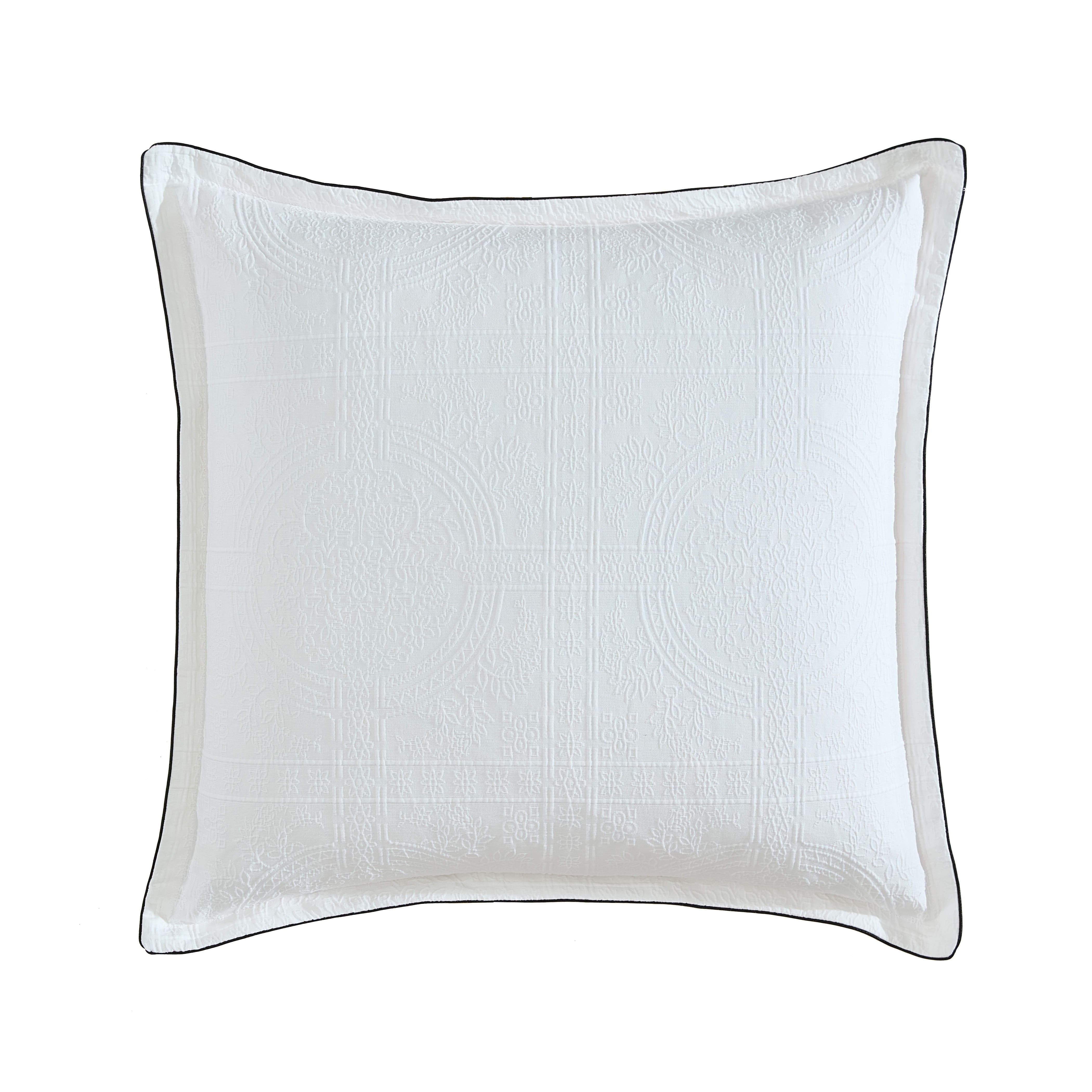 Catalina is a contemporary damask design in a crisp solid white, featuring a distinctive matelassé texture that creates a dynamic, eye-catching visual. The design is modernized with a striking contrast, highlighted by black corded piping along the edges. This combination of textures and details offers a sophisticated, fresh take on a classic style, perfect for contemporary spaces.