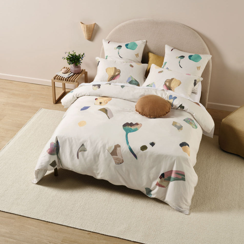 Hues of honey, turquoise and mauve on an off-white ground create this abstract print on cotton sateen, complete with a cord-piped trim, which looks even more delightful paired with its coordinating European pillowcases.