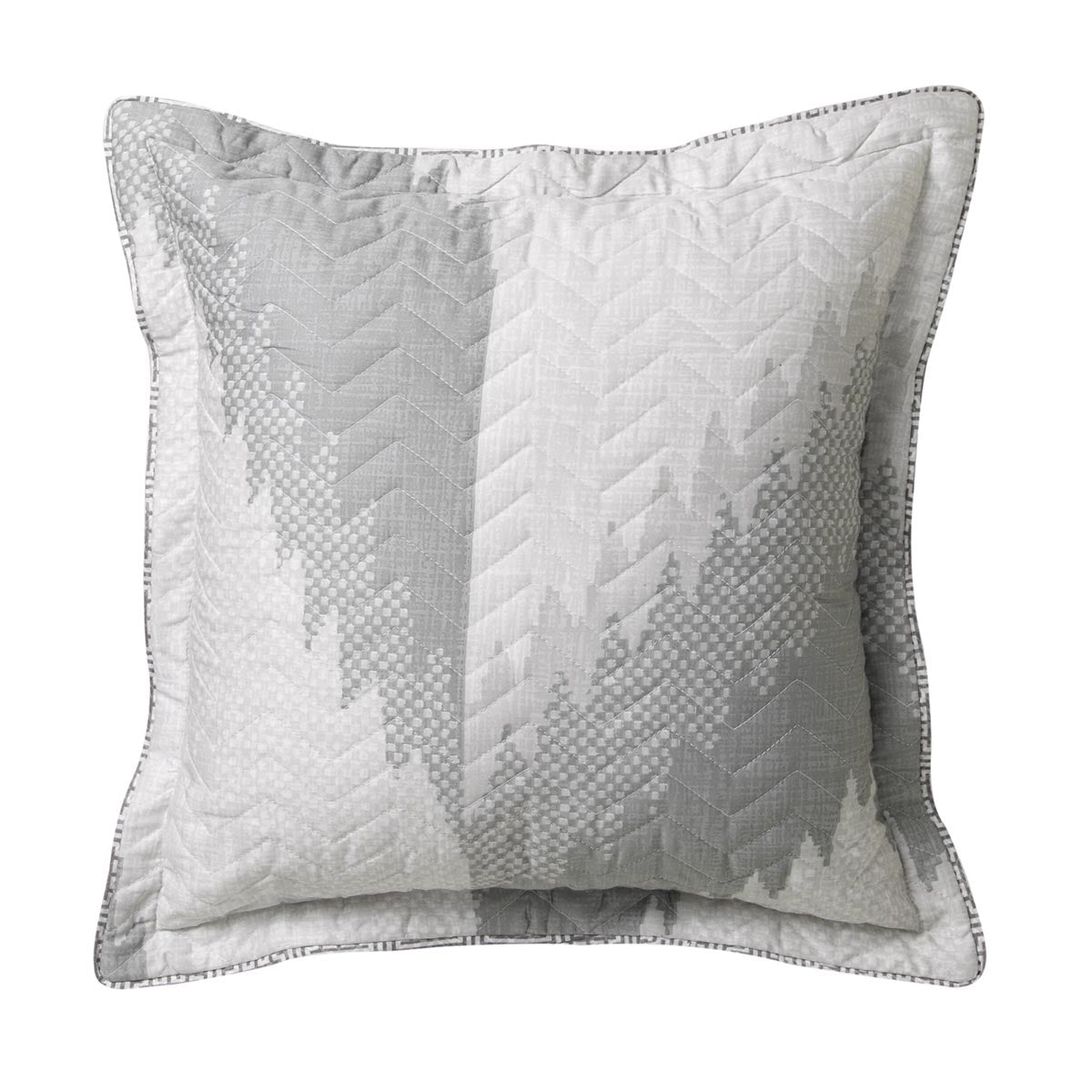 Flamestitch is modern geometric art. Big chevron graphics are arranged in vertical stripes. The overlay of shapes with pixelated squares, jagged lines and tonal variation creates the illusion of textured waves. Paired with Chinese Key in silver on the reverse and around the selfflanged edges, Flamestitch is on-point for the contemporary home.
