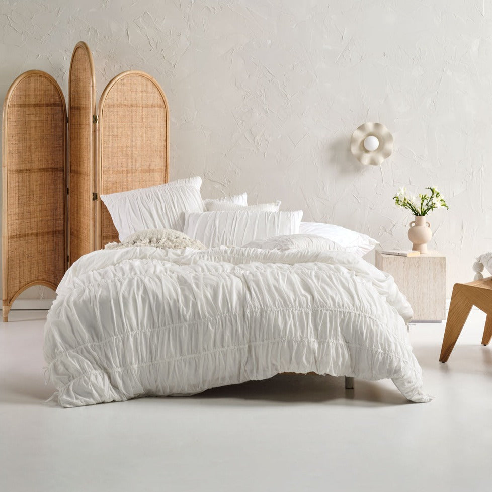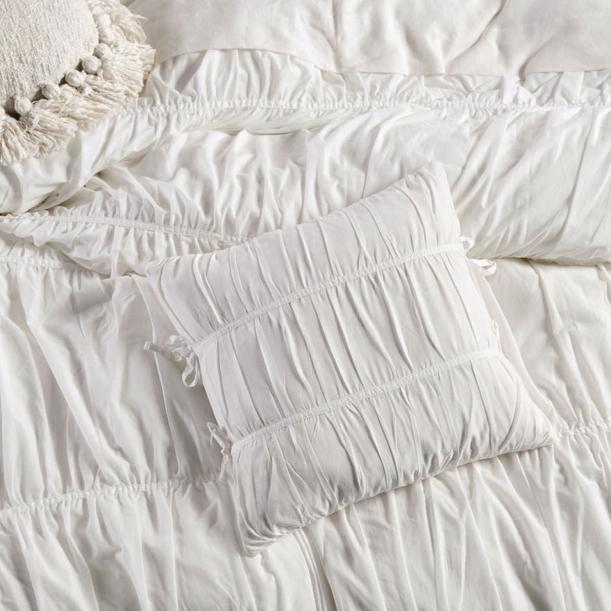 Constructed from delicate cotton voile, this romantic design in white incorporates vertical ruching throughout, creating a soft, pillowy dimension.