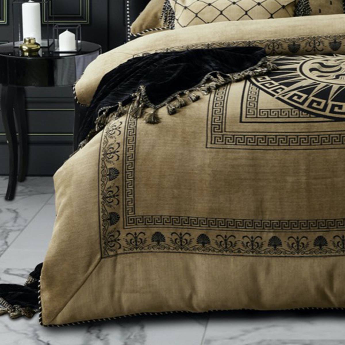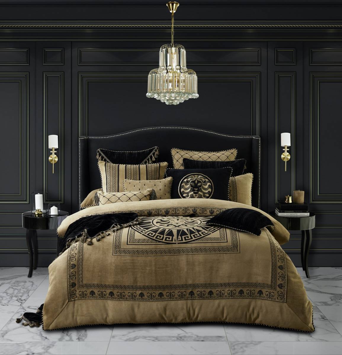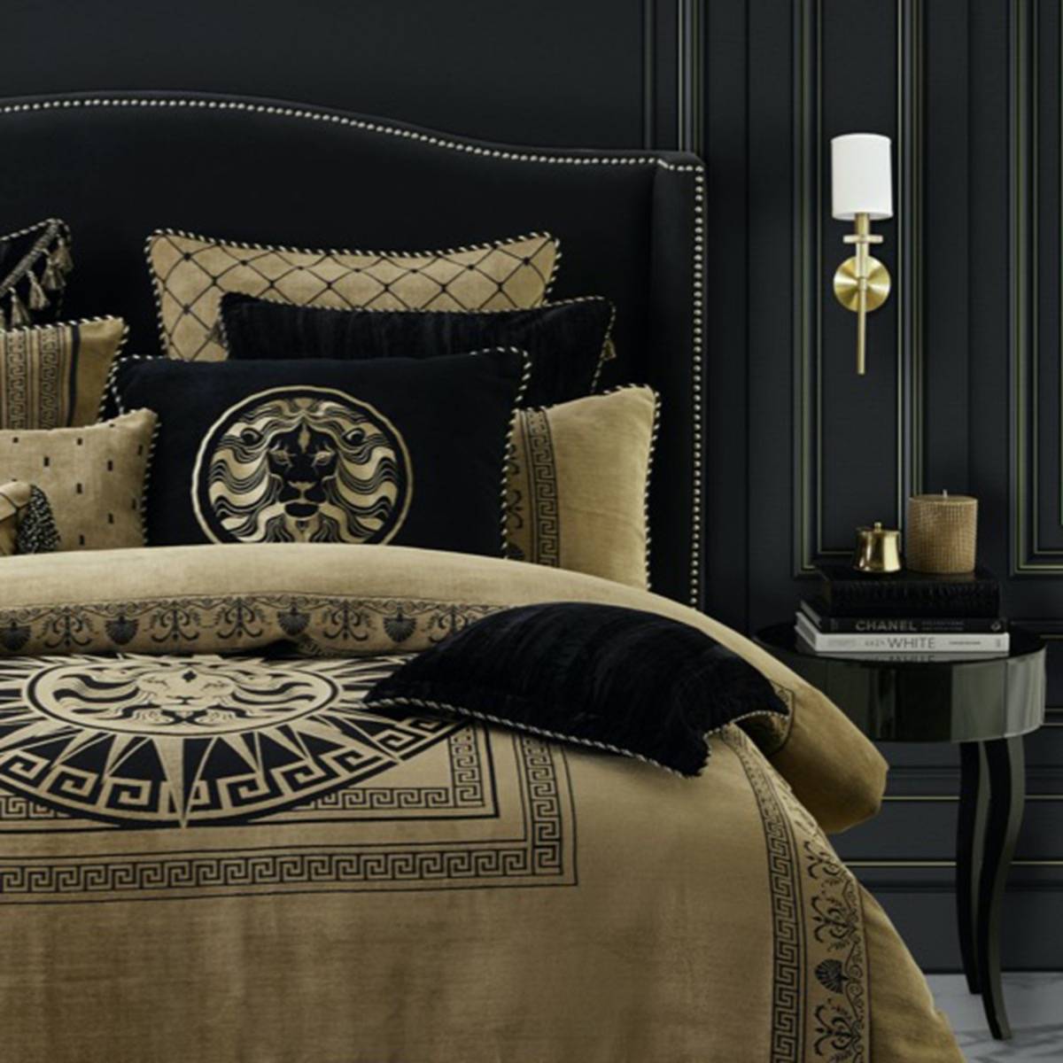 The Massimo Gold Quilt Cover Set by Davinci features a luxurious soft chenille with an imperial design boasting majestic lions and Greek key borders in a striking palette of black and gold. The Massimo range of co-ordinating accessories showcase multiple patterns with ornate trims for mix and match styling options. Also available in Black.