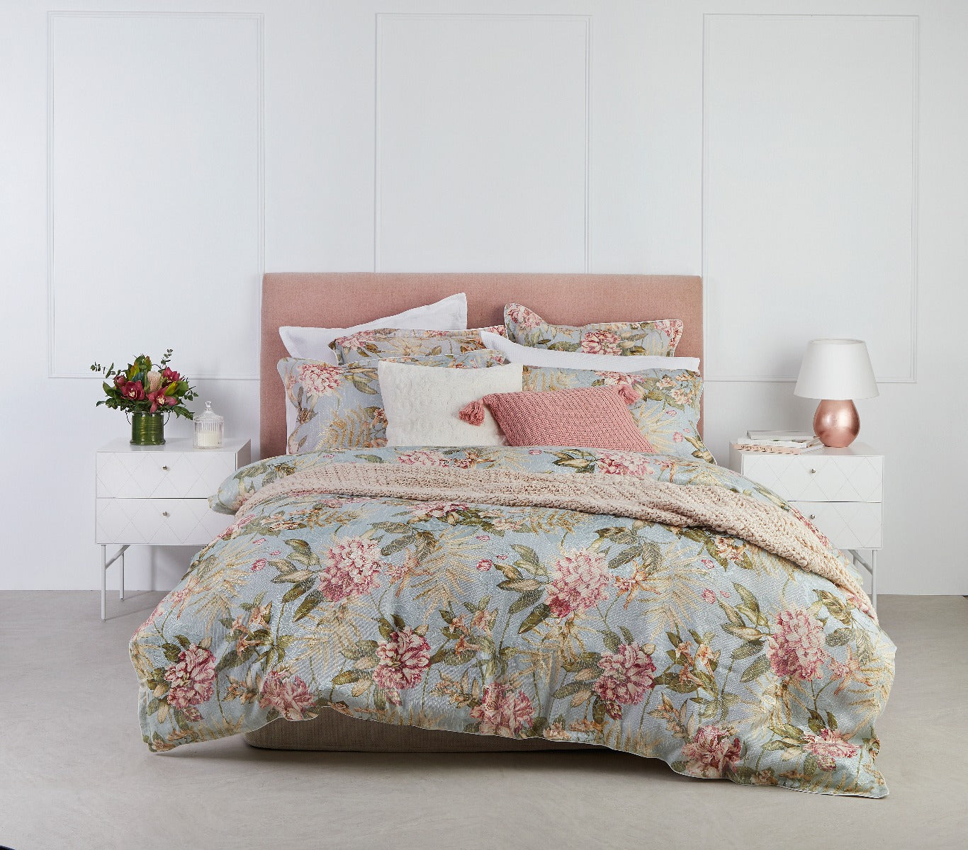 The Hazelwood Quilt Cover Set Green by Logan and Mason Platinum is imbued with garden freshness. This yarn-dyed jacquard is overprinted with colourful floral blooms, artfully creating the illusion of texture and depth. Self-flanged and piped edges complete the look.