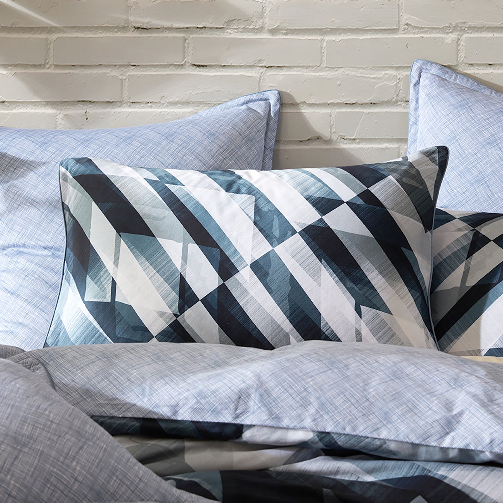 Bold and masculine, Soren features striking diagonal geometric patterns in a sleek palette of navy, grey, and white. The dynamic design is framed with refined navy piping, while the freehand line reverse offers contrast for a balanced look. Perfect for a contemporary space, this set blends sharp style with effortless sophistication.