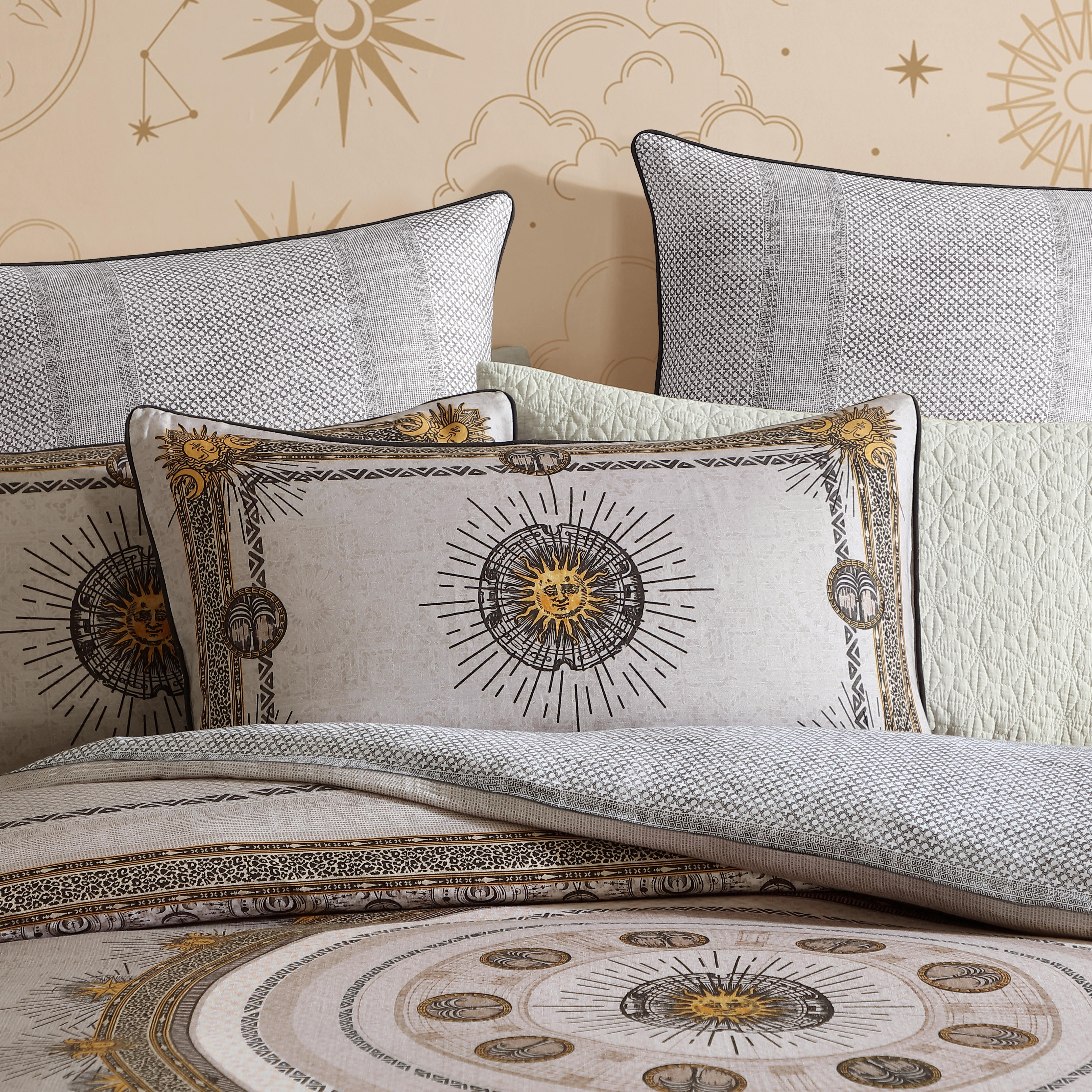 Embrace mystical boho charm with the Zepher. A Greek Sun Medallion sits upon a stone mosaic pattern ground with pops of golden yellow and defined charcoal details. The borders incorporate a leopard-style pattern with tribal elements, while the reverse showcases a charcoal and white mosaic tile stripe and finished with charcoal piping.