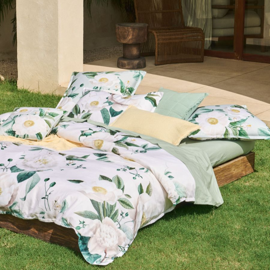 Loretta's delicate and equally romantic floral is designed to create a super-polished boudoir. Beautifully detailed and large-scale, this lovely palette is printed across cotton sateen to trigger those luxe summer sleep-ins we all dream of.