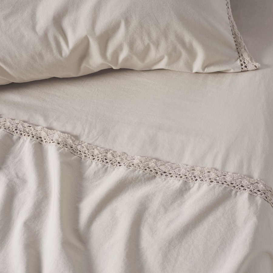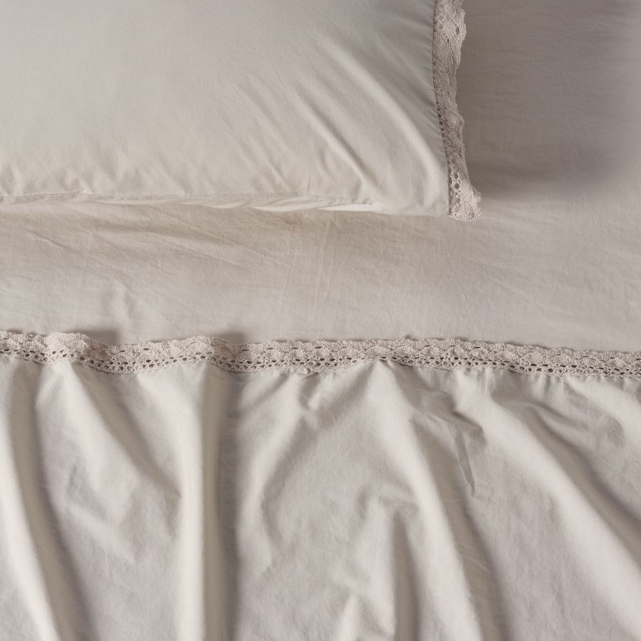 A dainty, romantic aesthetic you'll relish at first sight, Marion's delicate design lends itself to a lovely cotton lace trim to finish its 250 thread washed organic cotton.