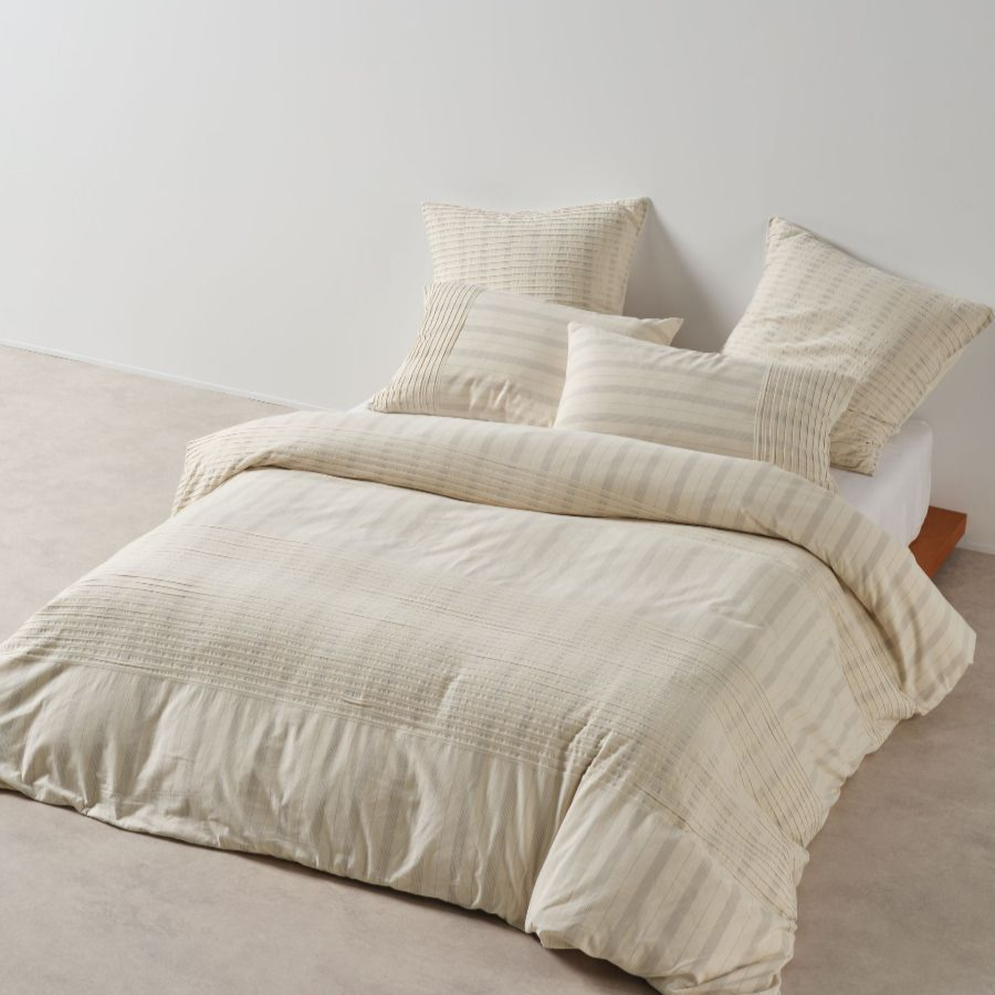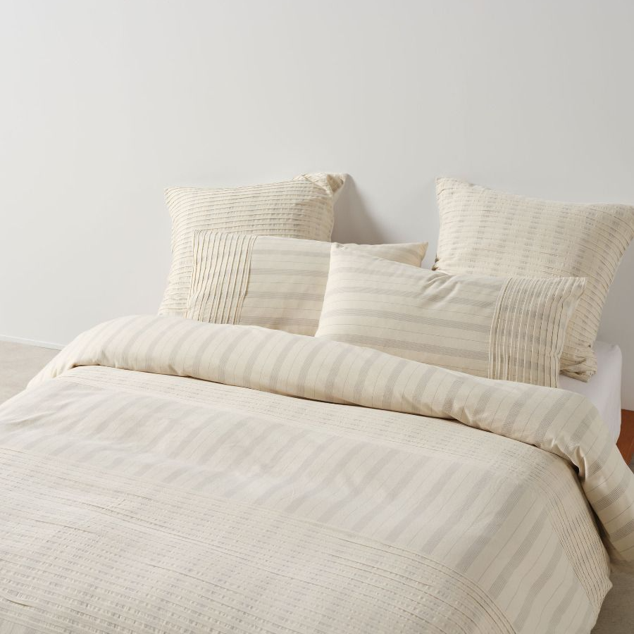 Created for those who seek bedroom tranquillity, Pambula is a yarn-dyed cotton beauty that exudes just this. Adorned with vertical stripes in neutral shades, this set includes pleats woven in at intervals, for a charming hint of texture, and volume.
