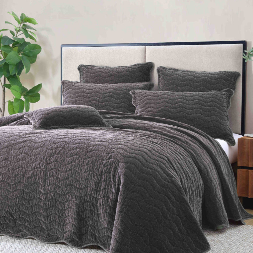 Add a touch of softness and opulence with this classic velvet featuring a modern twist. The striking charcoal is piece-dyed and stonewashed to enhance the depth of colour with a vintage appeal. The simple twin curved quilting is elegantly framed by scallop edging. It’s finished with a cotton-bound edge, stonewashed to provide a sophisticated contrast to the velvet.