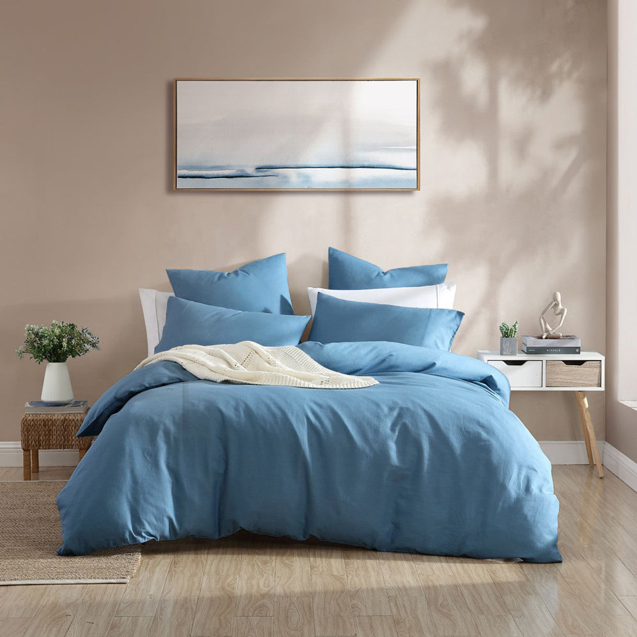 The Logan and Mason Platinum Serene Denim Quilt Cover Set features a cool soft hand feel and natural fibres piece dyed in colours Celadon, Charcoal, Denim, Natural and Teal and are a great addition to any bedroom collection. Sizes ranging from Single bed right through to Super King.
