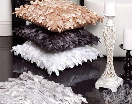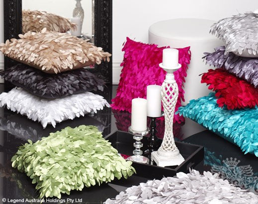 Fashionable Izzy Square Cushion features plain faux satin silk with flowing petal applique on the front and plain faux satin silk on the reverse.