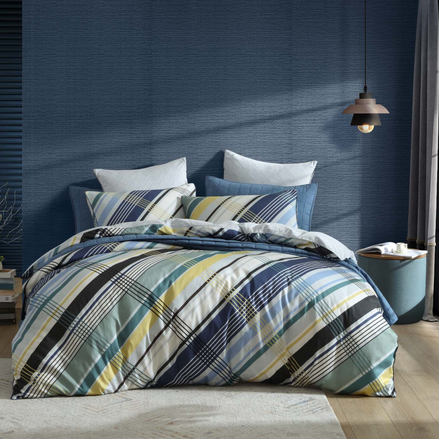Modern styling composed stripes at 45-degree angles portrays a contemporary twist to a traditional plaid. Varying stripe widths catches the eye, while the blue colour theme provides a fresh colour palette to you interior. Detail in the flat piping edging, a contrasting twill pairs superbly with the organic drawn twill on the reverse printed fabric.