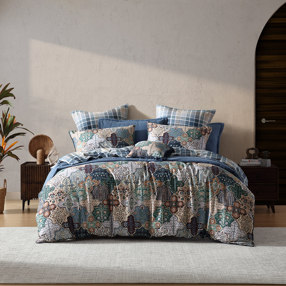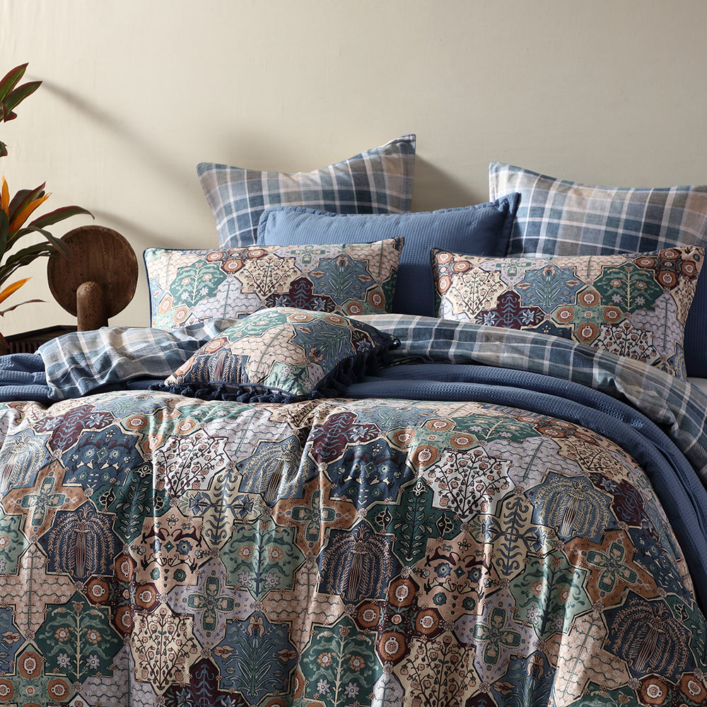 Introducing the Ferdinand quilt cover set, where boho chic meets contemporary elegance. This design refreshes the classic bohemian aesthetic with a Turkish tile-inspired motif, hand-drawn to capture intricate flowers and delicate details. The complementary natural colors create a serene and inviting ambiance, perfect for a cozy retreat. Flip it over to reveal a multi-color check design on the reverse, adding a playful touch and versatile style. The Ferdinand quilt cover set seamlessly combines artistic air with everyday comfort, making it a distinctive addition to any bedroom decor.