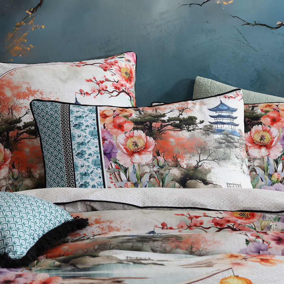 Elevate your bedroom with the Kaida quilt cover set, a stunning fusion of Oriental-inspired elegance and artistic air. This quilt cover set features watercolor-painted lanterns, fans, and orals, capturing a sense of timeless beauty and grace. The design is framed with striking teal, black, and white border prints, enhancing the intricate central landscape scene and adding a sophisticated touch.
