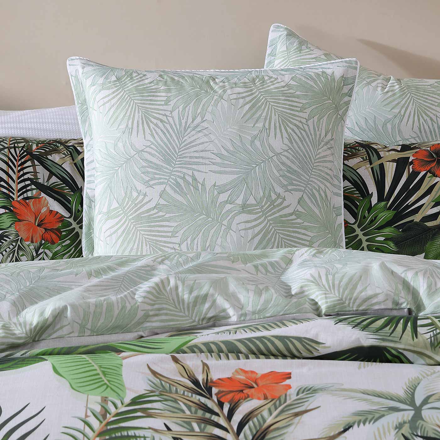 Lanai Palm gets you dreaming of those balmy Hawaiian nights. Hibiscus flowers bloom amongst tropical palms in a design just made for summer. A subtle foliage pattern on the reverse completes this fresh, relaxing theme. Match with European pillowcases to elevate this stunning look.
