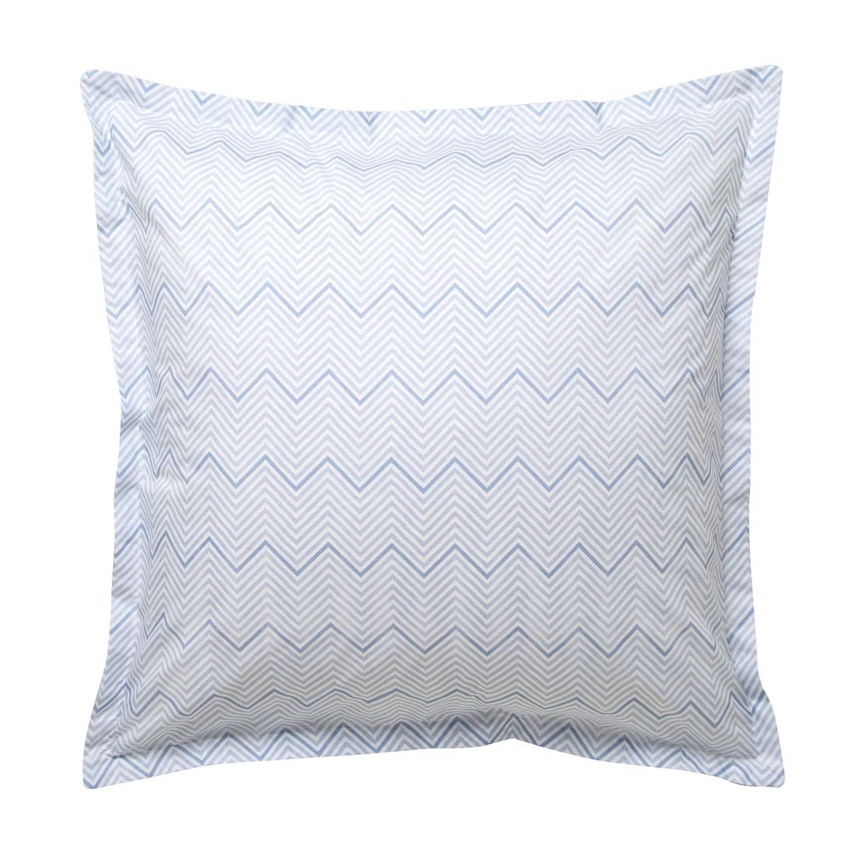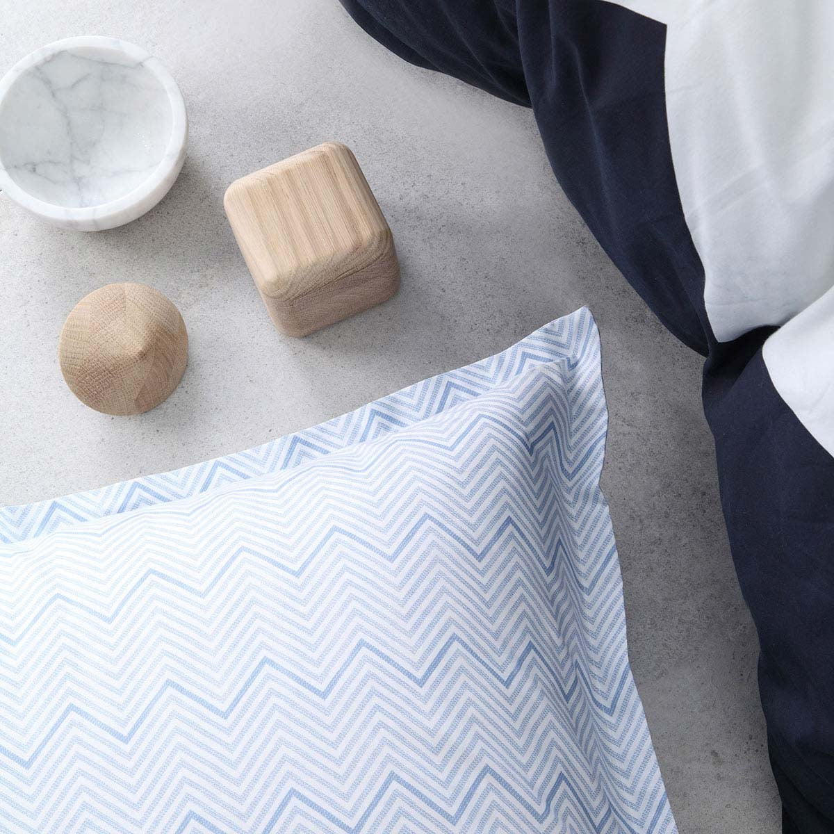 Horizontal zig-zags, in neutral navy and white, are softened by calming sky-blue with textured-look pattern, reversing to small chevron in tonal sky for a clever interplay of scales.