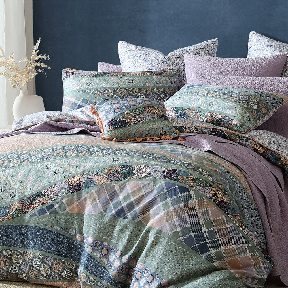 Introducing the Ophelia quilt cover set, a harmonious blend of bohemian charm and artistic air. Soft, wave-like patterns create a gentle, owing design that exudes a relaxed boho vibe. The front features delicate watercolor orals, their muted hues beautifully contrasted against a calming moss green check pattern, evoking a sense of serene sophistication. Flip the quilt cover over to reveal a captivating fan-shaped watercolor pattern, adorned with orals and painterly strokes, adding an extra layer of artistic depth. The Ophelia quilt cover set seamlessly combines soft, owing designs with rich, complementary textures, transforming your bedroom into a tranquil, stylish retreat.