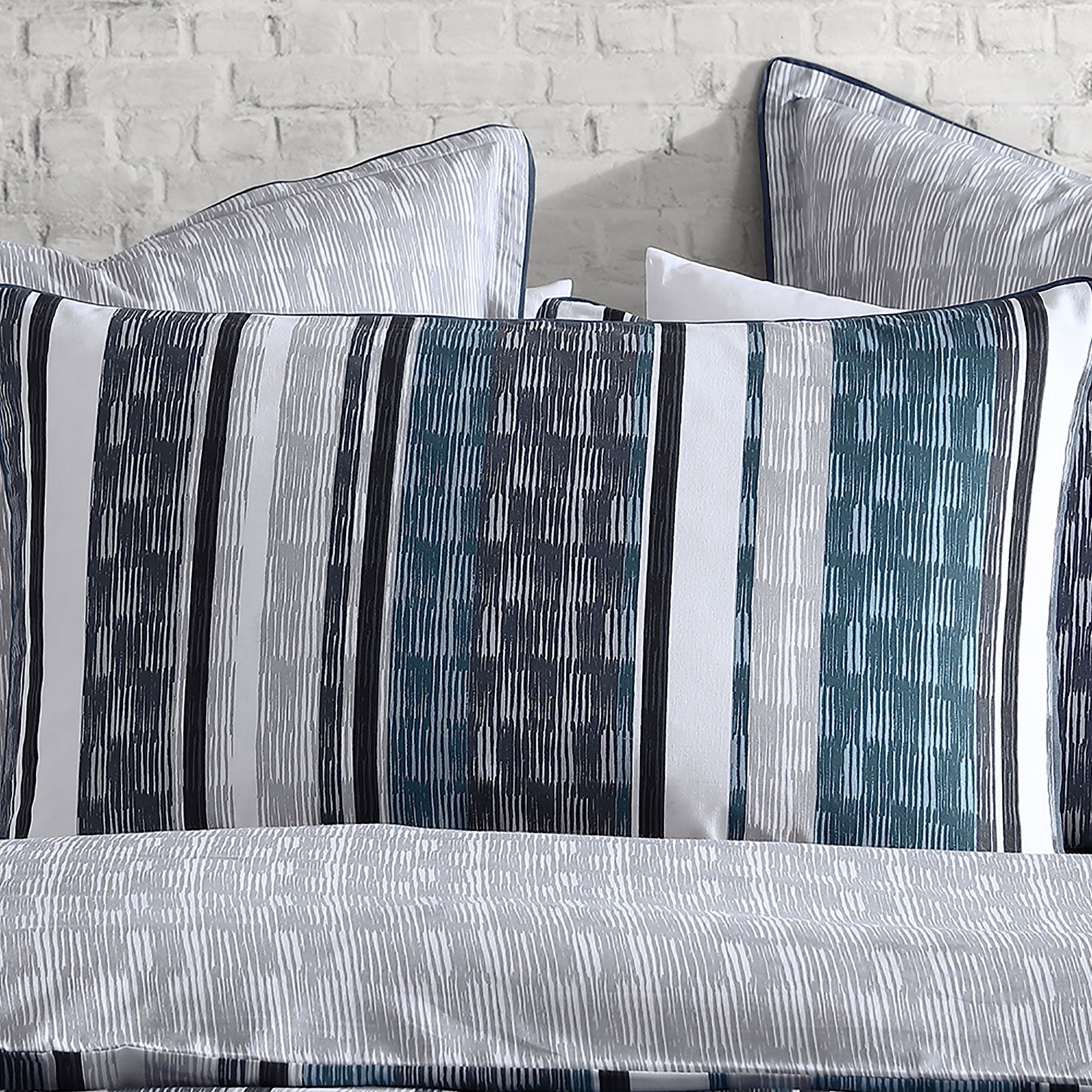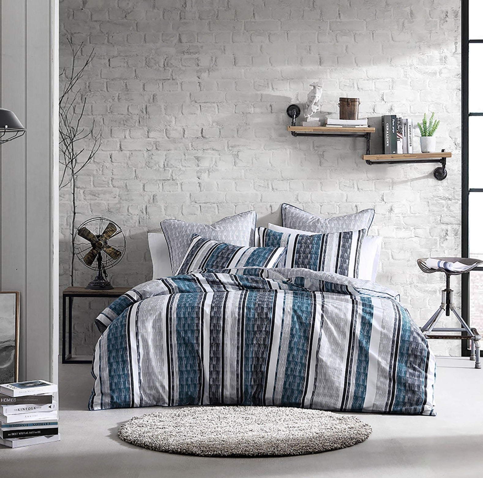 Bring a masculine edge to your bedroom with Porter Steel. Vertical, textural stripes in shades of silver, charcoal, teal and navy, make a strong statement in style. This bold, graphic design is framed with dark navy piping to finish off. Match with co-ordinating European pillowcases to complete this contemporary look.