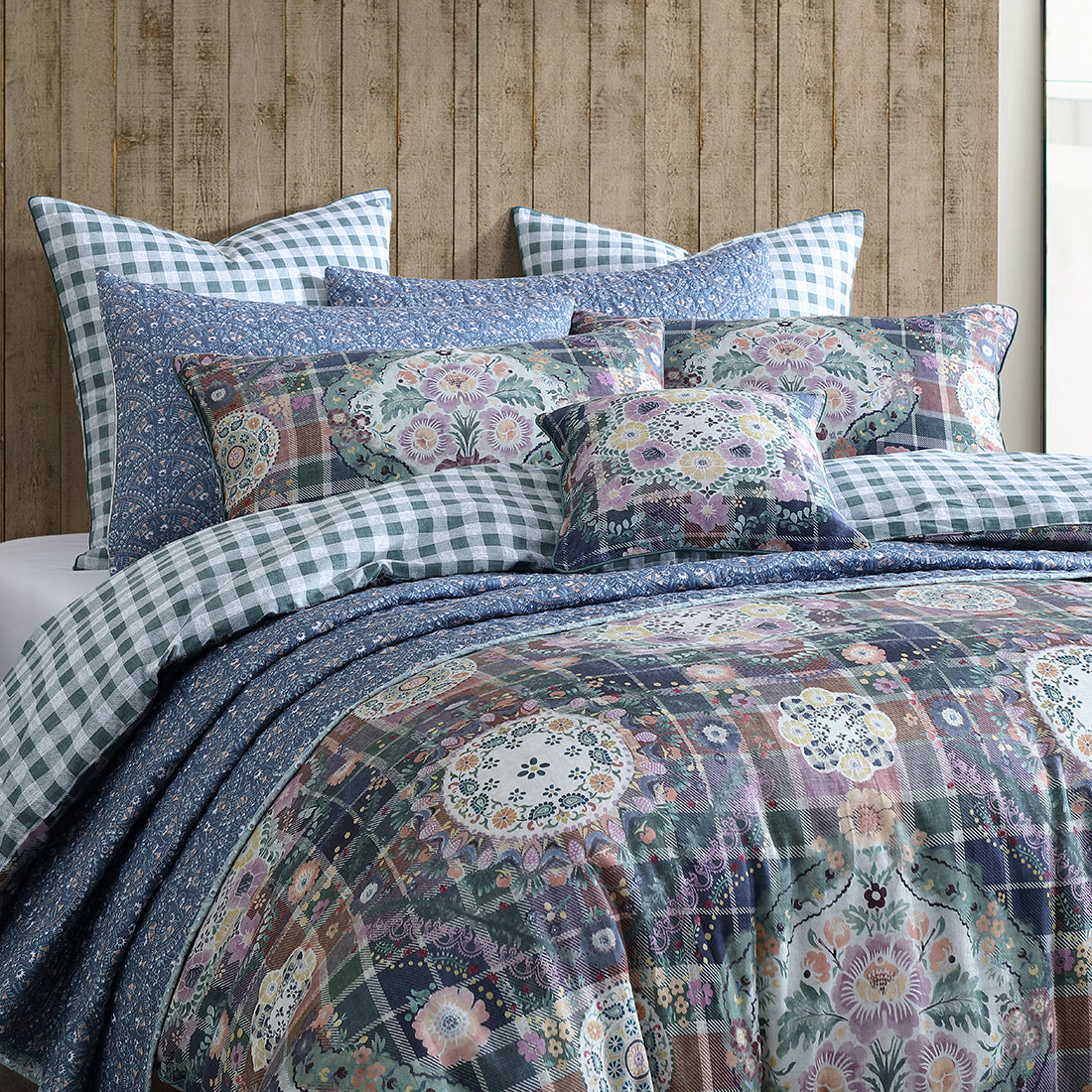 On the reverse side, a moss green and white textured check pattern provides a refreshing contrast, adding depth and versatility to the design. The Sabina quilt cover set effortlessly combines vibrant, artistic elements with a soothing, textured backdrop, making it a perfect choice for a chic and tranquil bedroom retreat