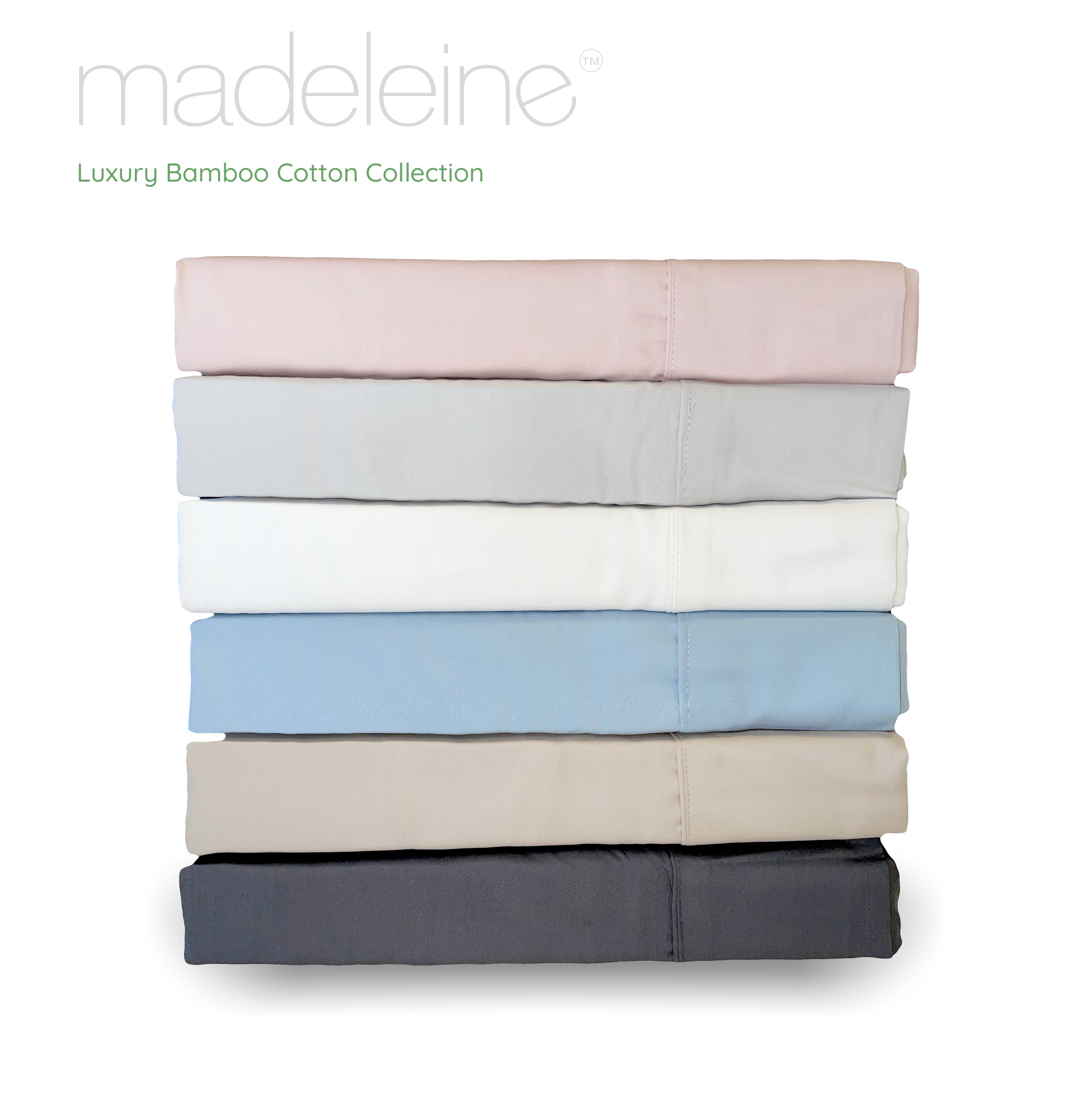 Luxury Bamboo Cotton Sheet Set at a luxurious 400TC for a sensual silky soft feel. For those people new to Bamboo, Bamboo is not only an eco-friendly material (as it can be grown chemically free), it also has naturally occurring anti-fungal and anti-bacterial components to it. Madeleine sheets have been well engineered for great durability and comfort.