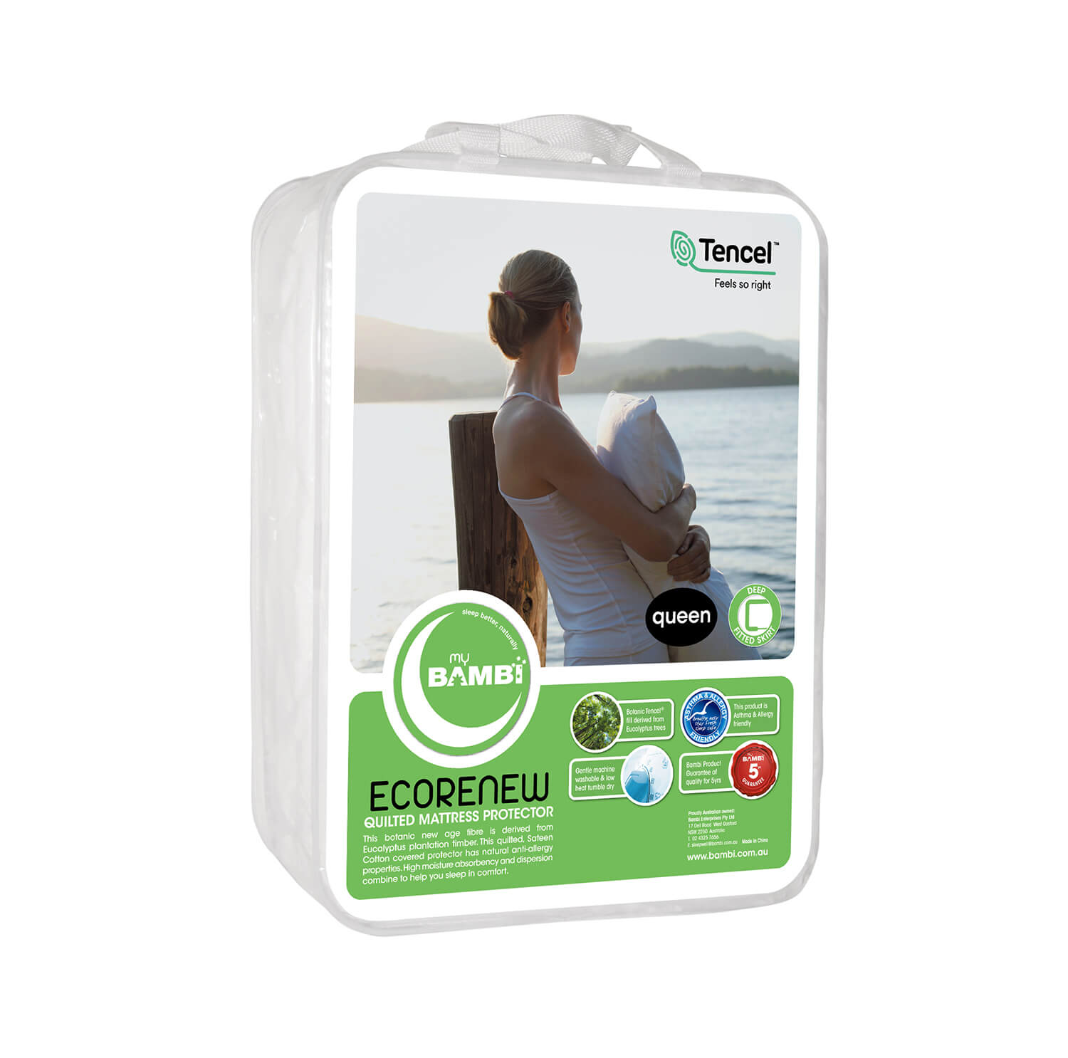 The Bambi Ecorenew Tencel® Mattress Protector is an eco-friendly fitted mattress protector, proudly made from Tencel® and encased in a 100% Australian Cotton cover. The Tencel® fill is luxuriously smooth and naturally hypoallergenic for a soft and sumptuous night’s sleep. Complete with an elasticised fitted skirt which will stretch to 55 cm for a snug fit every time.