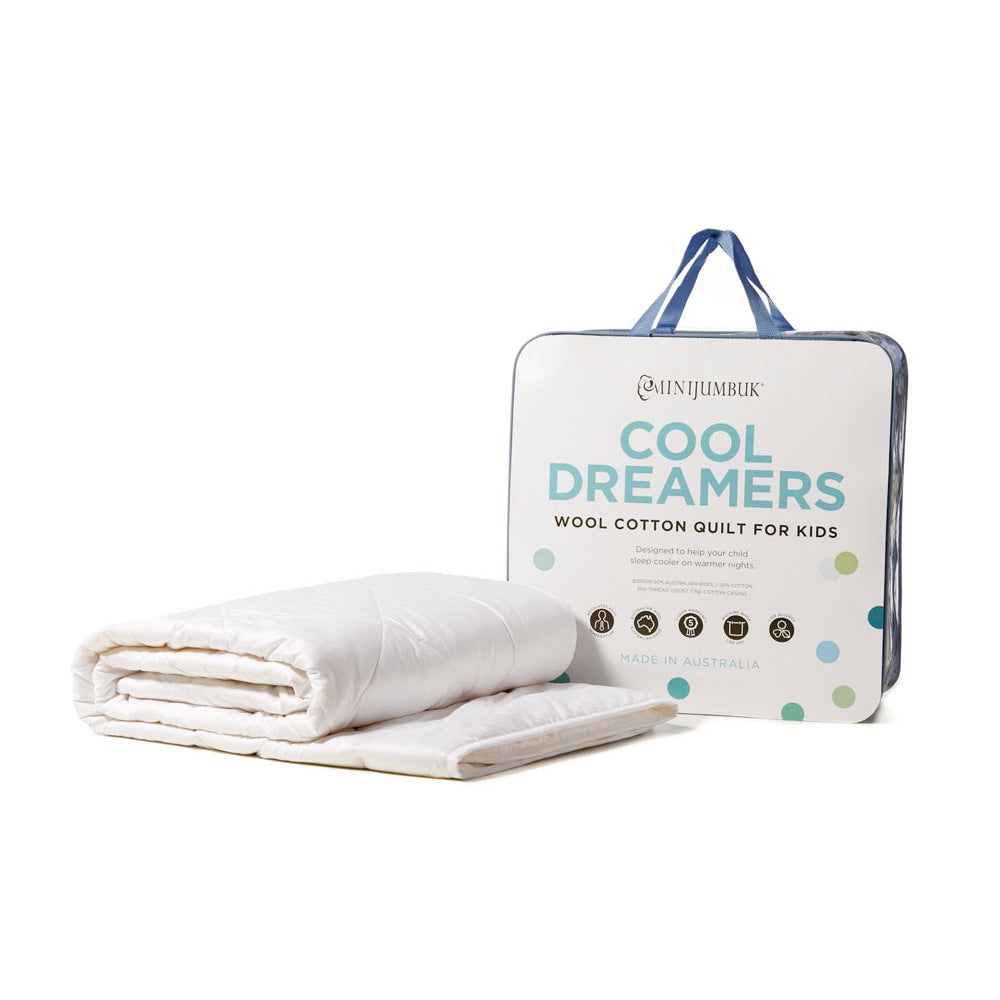 The MiniJumbuk Cool Dreamers Kids Quilt is designed to help your child sleep cooler on warmer nights, the Cool Dreamers quilt from the trusted Mini Jumbuk range has been made in Australia from a blend of natural Australian wool and cotton.