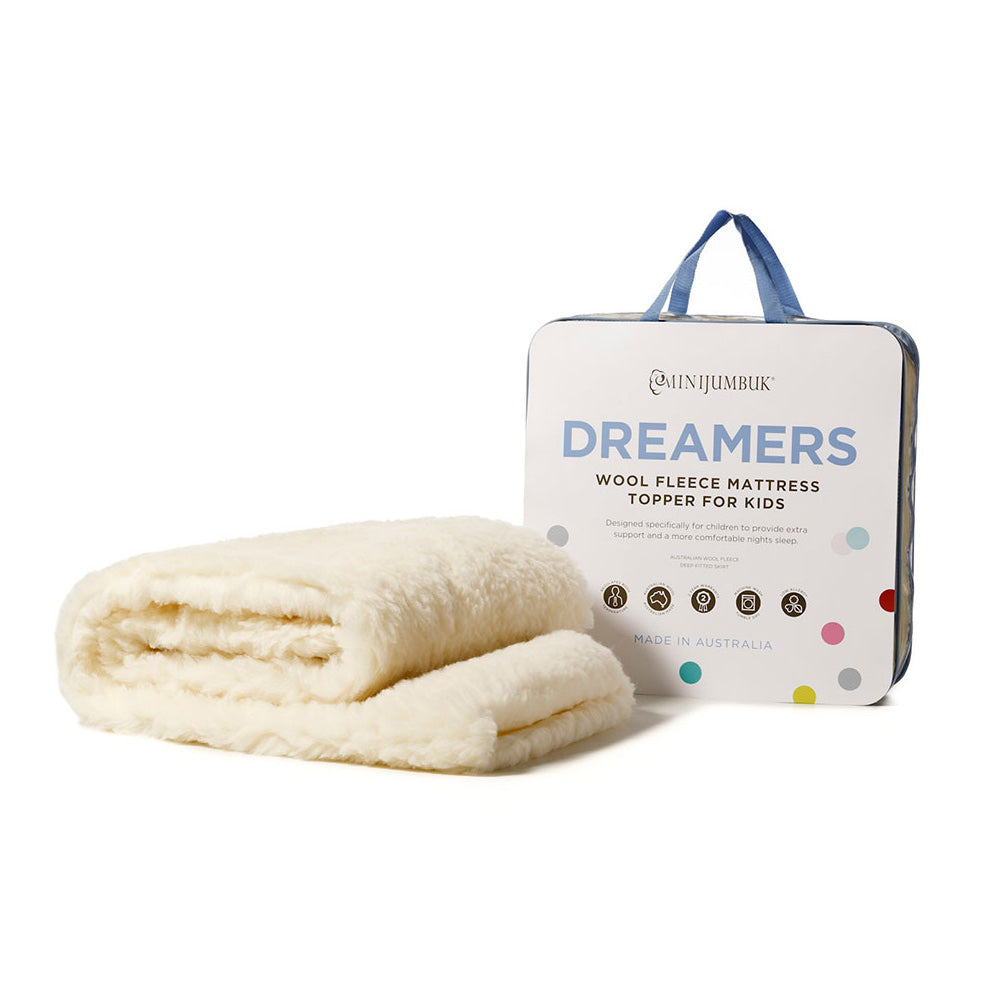 The Dreamers Kids Australian Wool Mattress Topper is designed specifically for children to provide extra support at bedtime, the Dreamers wool fleece mattress topper from the trusted Minijumbuk range contains natural Australian wool to regulate body temperature.