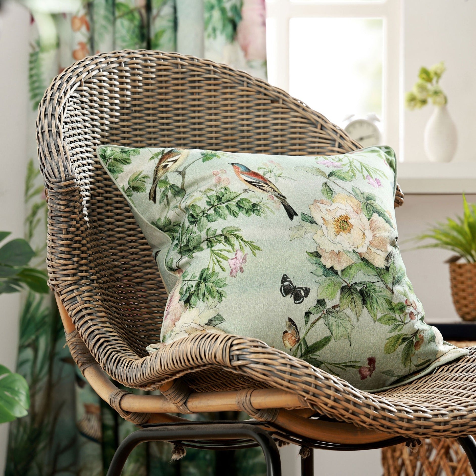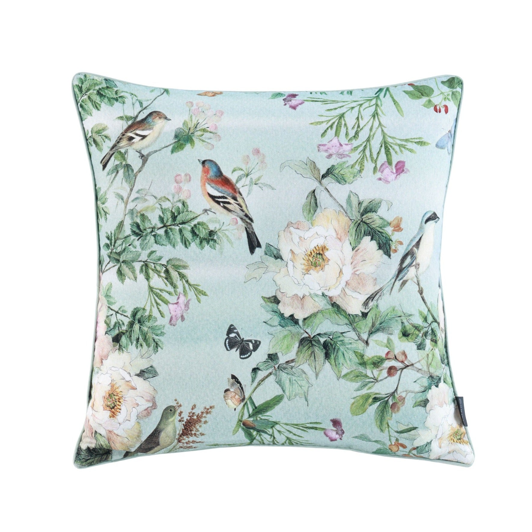 The sumptuous velvet Chinoiserie cushion by MM Linen depict ornate flora and fauna awashed with celadon green. Deep forest green fringe edges and plain deep green reverse side, in velvet.