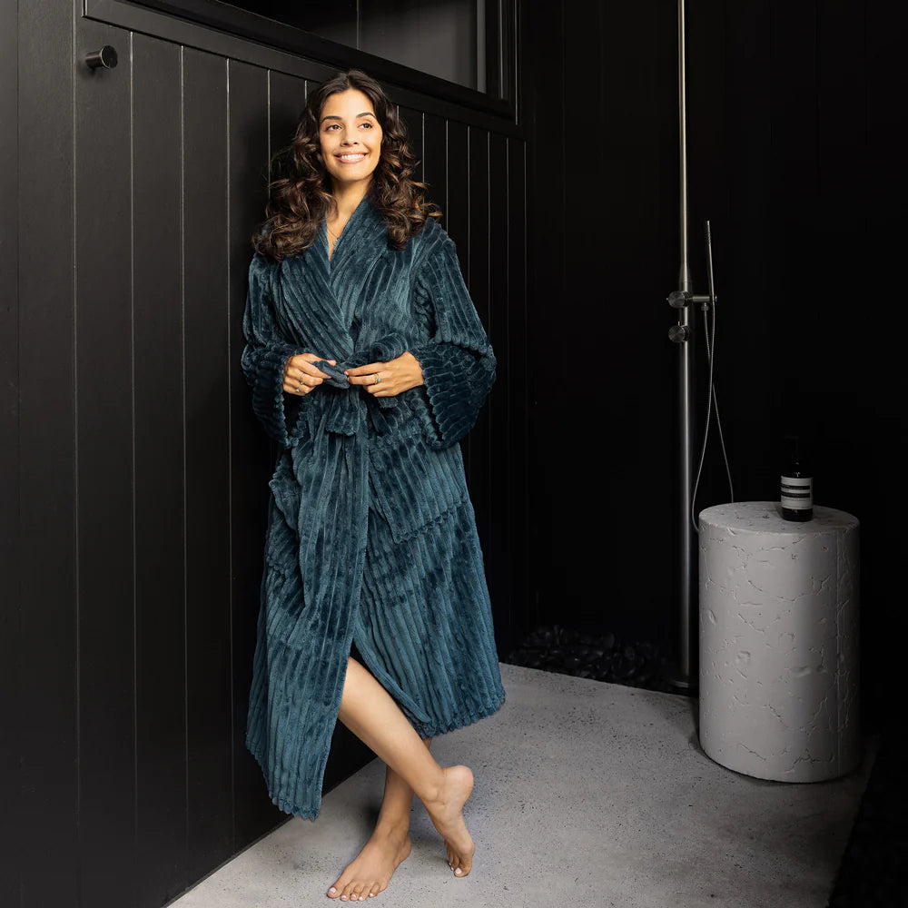 Indulge in luxurious comfort with the Channel Fleece Robe by Bambury, perfect for cozy nights at home. These solid-colored robes showcase a velour stripe design for added texture, complete with two convenient pockets and a matching belt for a customizable, cozy fit. Perfect for relaxing in exquisite warmth and sophistication.