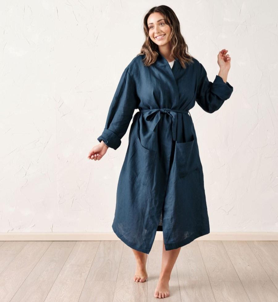 The epitome of effortless, the Linen House kimono-style Nimes robe in navy enjoys that lived-in style and breathable feel that can only be achieved with pure linen.