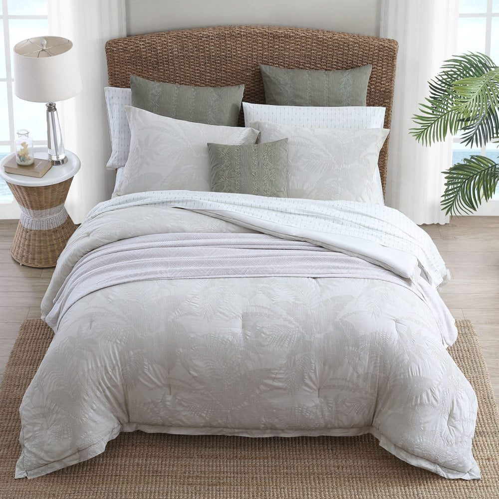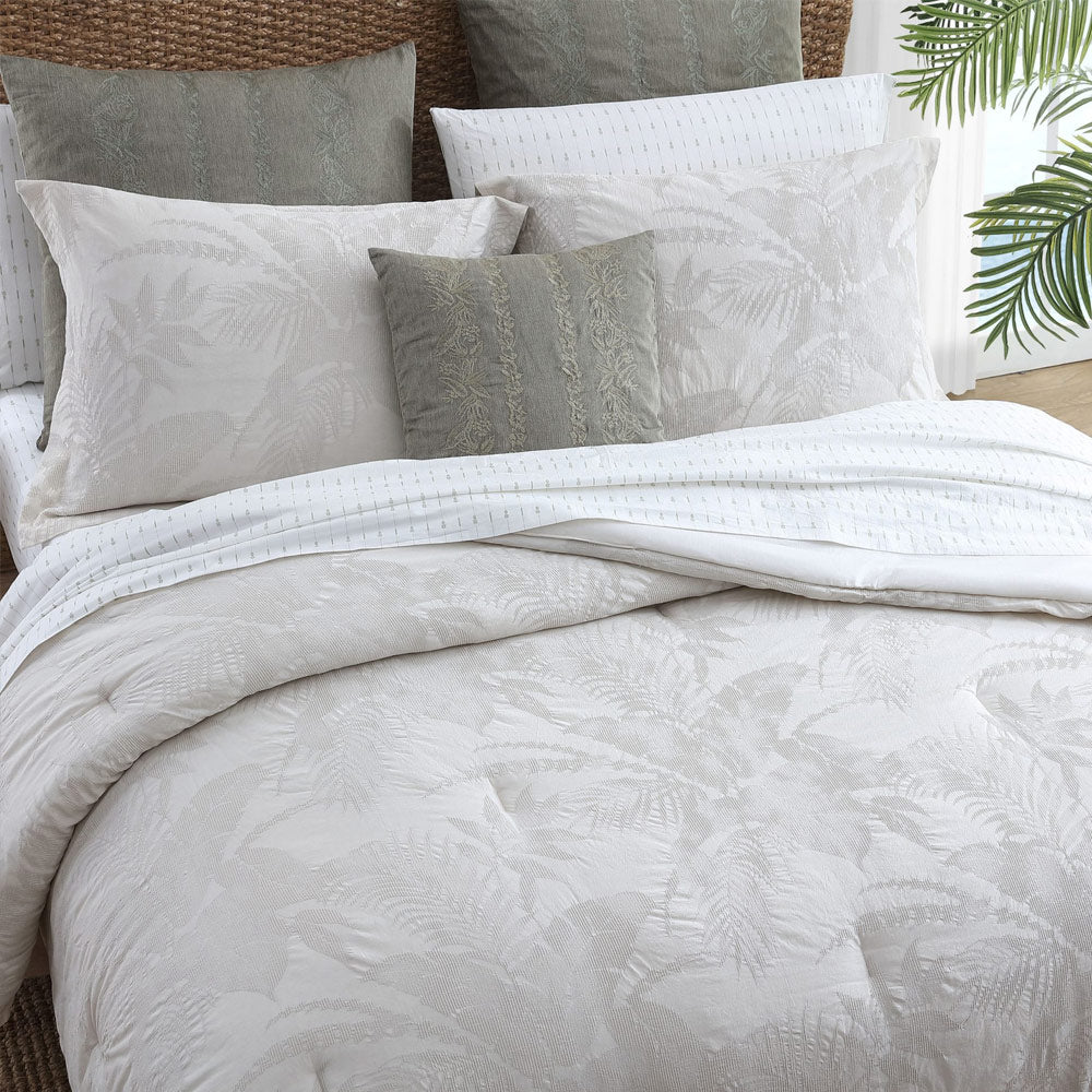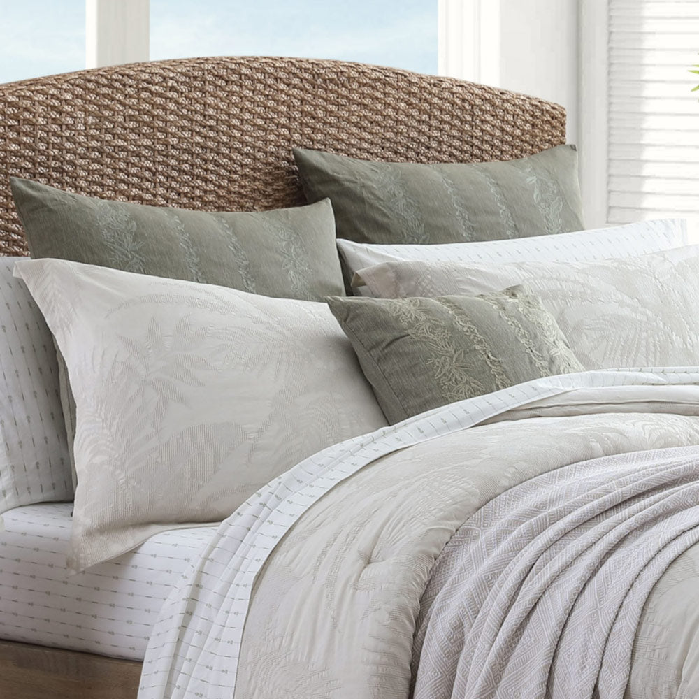 Incredibly soft and inviting in a soothing natural ivory tone, the Abalone Quilt Cover Set design from Tommy Bahama is the perfect update to your bedroom. This modern botanical design features a distressed washed finish that calls for a relaxing atmosphere.
